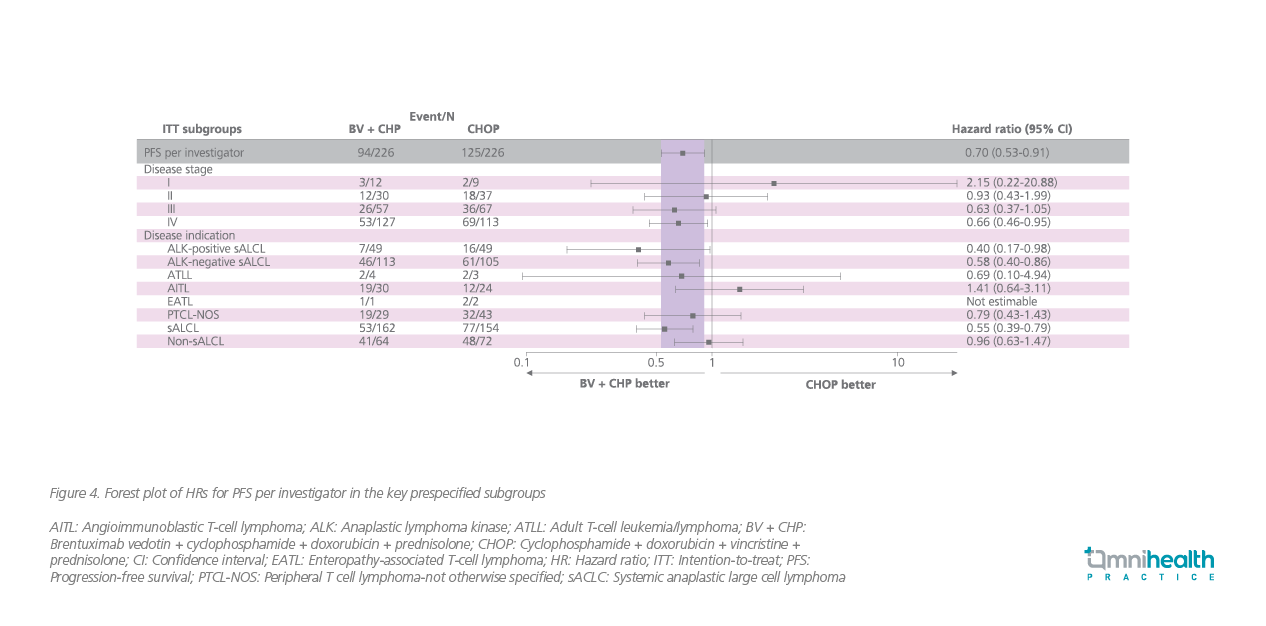 In the subgroup of sALCL patients, about 60.6% of patients remained progression-free after 5 years of the BV-CHP treatment (95% CI: 49.5%-69.9%) compared with 48.4% in the CHOP group (95% CI: 39.6% to 56.7%) (HR=0.55; 95% CI: 0.39-0.79; p=0.0009) (figure 3).7 Similar PFS benefits with the BV-CHP treatment were observed across different subgroups of patients, including those with ALK-positive and ALK-negative sALCL (figure 4).7