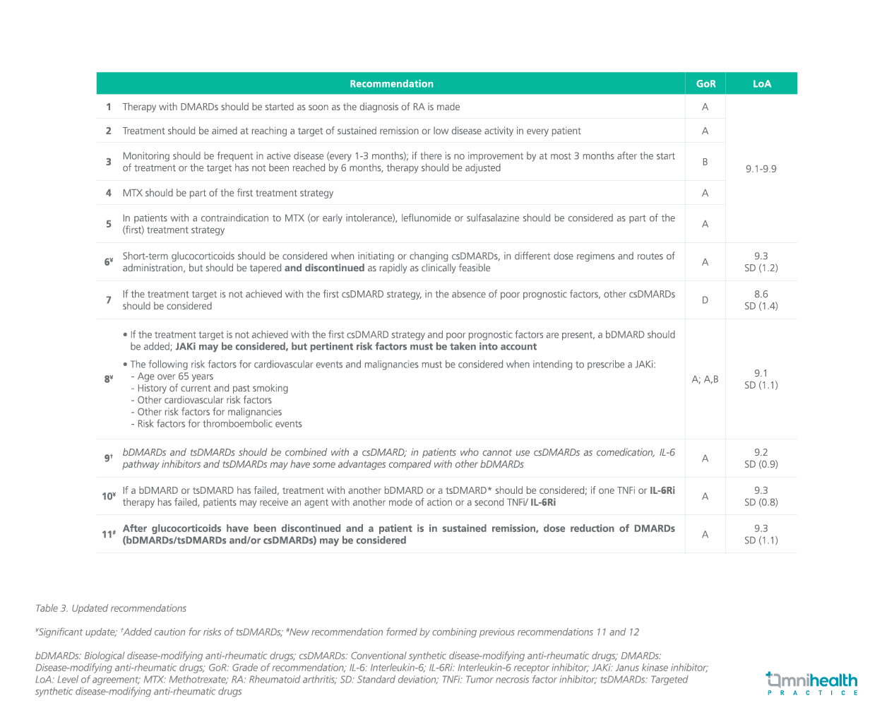 The 2022 update consists of a total of 11 recommendations: 6 areunchanged from the previous recommendations (#1, 2, 3, 4, 5 and7), 3 are significantly updated (#6, 8, and 10), 1 recommendation hasasterisks for risks of targeted synthetic (ts) DMARDs added (#9), and 1was newly formulated (#11) by combining previous recommendations#11 and #12.1 The updated guidelines are listed in table 3.1