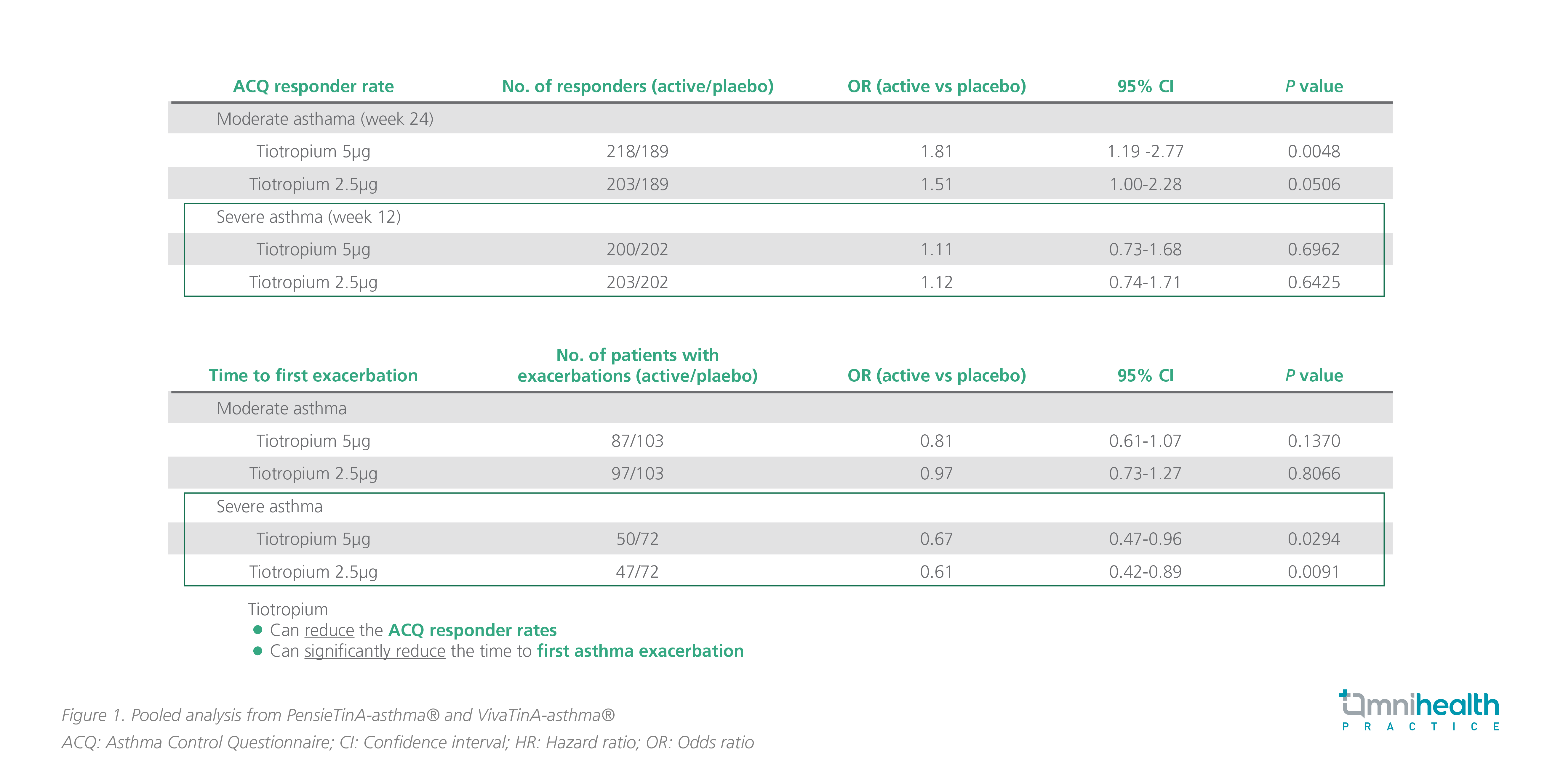 Both doses of tiotropium demonstrated significantly greater improvements in peak FEV1(0-3h) response vs. placebo in moderate and severe asthma.8 Patients with severe asthma had an increase of 117mL and 74mL in peak FEV1(0-3h) in the tiotropium 5μg and 2.5μg groups, respectively (95% CI: 51-183, p=0.0005 and 95% CI: 8-140, p=0.0273, respectively).8 Moreover, trough FEV1 and FEF25%-75% at week 12 for patients with severe symptomatic asthma were statistically and significantly improved compared with placebo, except for trough FEV1 at a tiotropium dose of 2.5μg.8 In severe asthma, The ACQ responder rates were higher among patients receiving tiotropium 5μg or 2.5μg than patients receiving placebo (OR=1.11; 95% CI: 0.73-1.68; p=0.6962 and OR=1.12; 95% CI: 0.74-1.71; p=0.6425, respectively) (figure 1).8 Both tiotropium doses led to a statistically significant reduction in the time to first asthma exacerbation vs. placebo in severe asthma (HR=0.67; 95% CI: 0.47-0.96; p=0.0294 for tiotropium 5μg; HR=0.61; 95% CI: 0.42-0.89; p=0.0091 for tiotropium 2.5μg).8