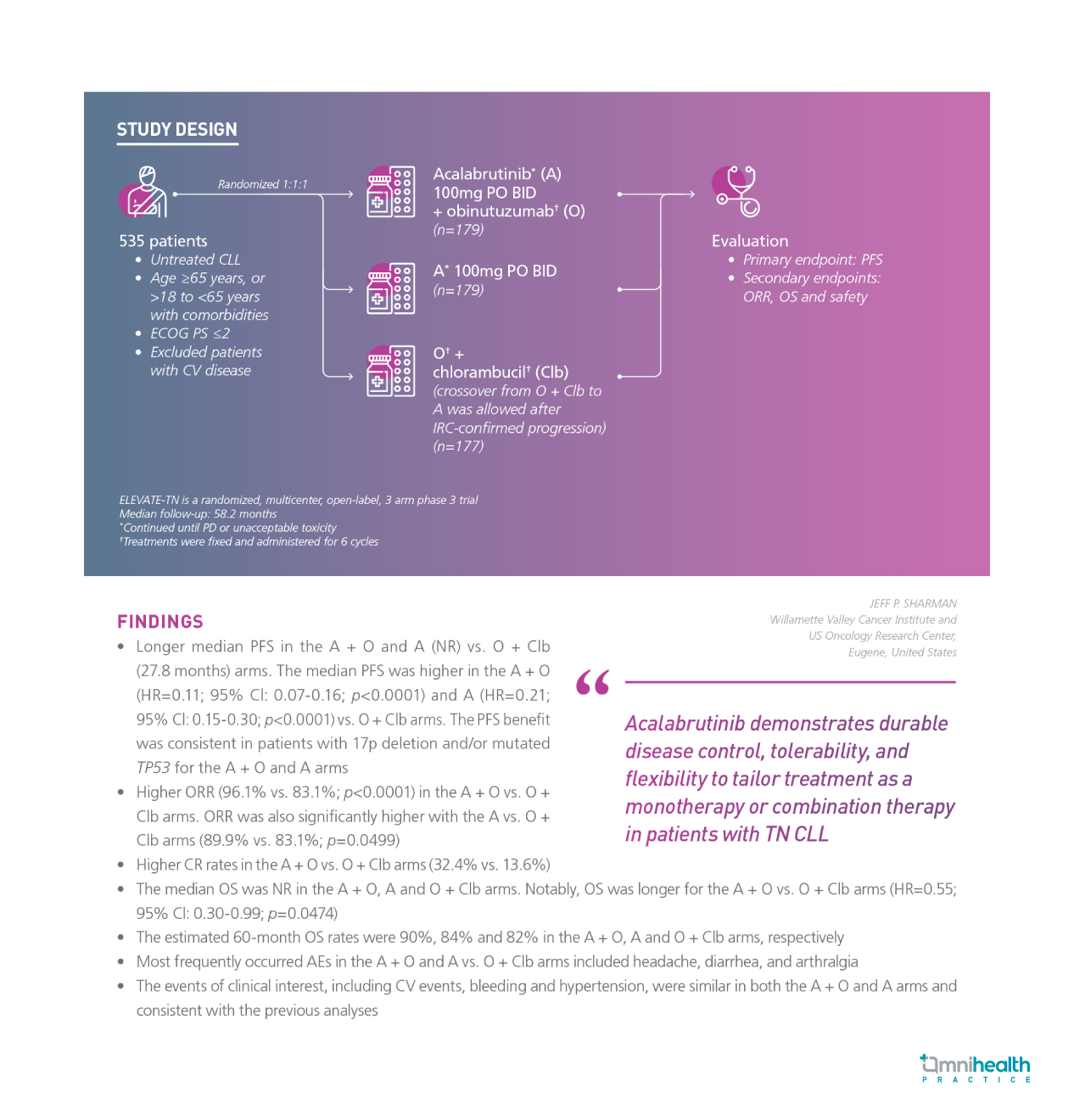 Glossary: 17p: Chromosome 17p; AEs: Adverse events; BID: Twice a day; CI: Confidence interval; CLL: Chronic lymphocytic leukemia; CR: Complete response; CV: Cardiovascular; ECOG: Eastern Cooperation Oncology Group; HR: Hazard ratio; IRC: Independent Review Committee; NR: Not reached; ORR: Overall response rate; OS: Overall survival; PD: Progressive disease; PFS: Progression-free survival; PO: Oral; TN: Treatment-naïve; PS: Performance status; TP53: Tomor protein 53