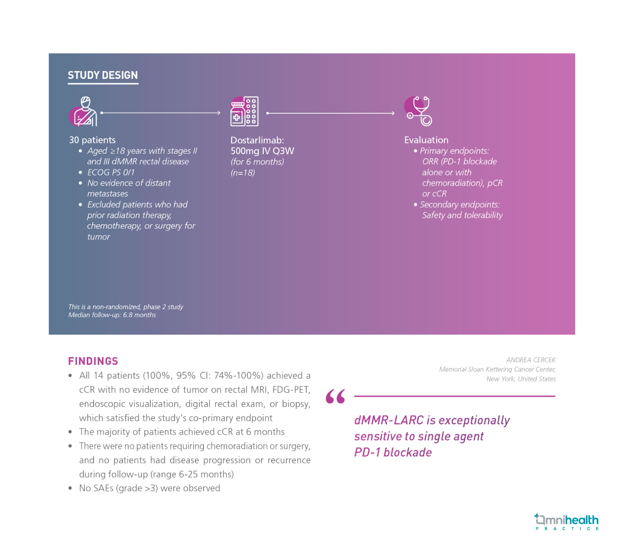 Glossary: cCR: Clinical complete response; CI: Confidence interval; dMMR: Mismatch repair deficient; ECOG: Eastern Cooperation Oncology Group; FDG: Fluorodeoxyglucose; IV: Intravenous; LARC: Locally advanced rectal cancer; MRI: Magnetic resonance imaging; ORR: Overall response rate; pCR: Pathologic complete response; PD-1: Programmed death 1; PET: Positron emission tomography; PS: Performance status; Q3W: Every 3 weeks; SAEs: Serious adverse events