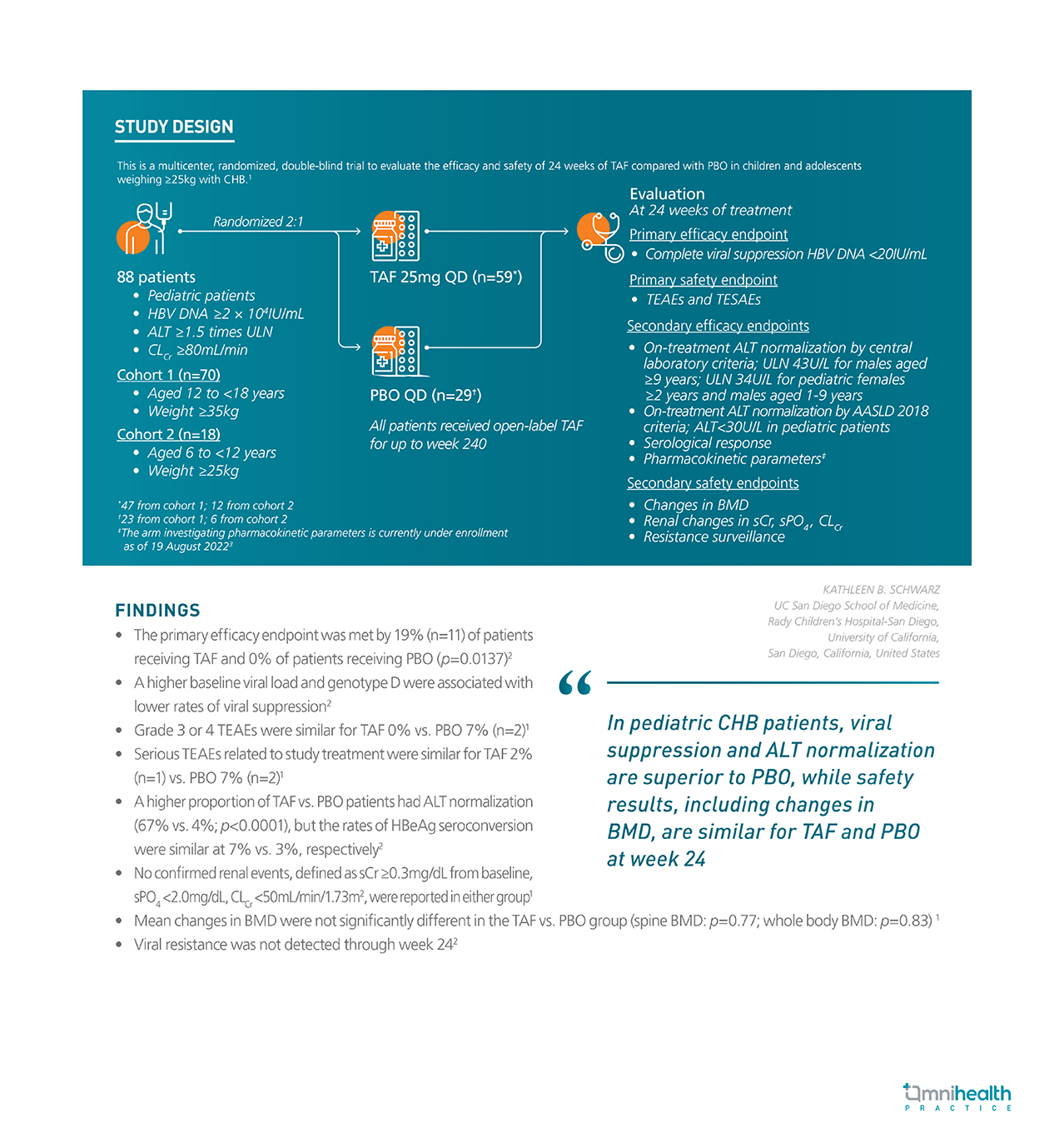 Glossary: AASLD: American Association for the Study of Liver Diseases; ALT: Alanine aminotransferase; BMD: Bone mineral density; CHB: Chronic hepatitis B; CLCr: Creatinine clearance; HBeAg: Hepatitis B e-antigen; HBV: Hepatitis B virus; DNA: Deoxyribonucleic acid; PBO: Placebo; QD: Once a day; sCr: Serum creatinine; sPO4: Serum phophorus; TAF: Tenofovir alafenamide; TEAE: Treatment emergent adverse event; TESAE: Treatment emergent serious adverse event; ULN: Upper limit of normal