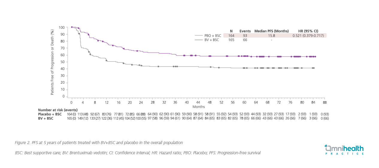 Regarding safety, the initial results of the AETHERA trial showed that about 56% of patients treated with BV reported peripheral neuropathy vs. 16% in the placebo group.3 In the 5-year follow-up, 90% of patients who experienced peripheral neuropathy in the BV group reported resolution or improvement. Among them, 73% had achieved complete resolution.4 The median time to resolution or improvement of peripheral neuropathy in the BV group was 37.6 weeks vs. 9.1 weeks in the placebo group.