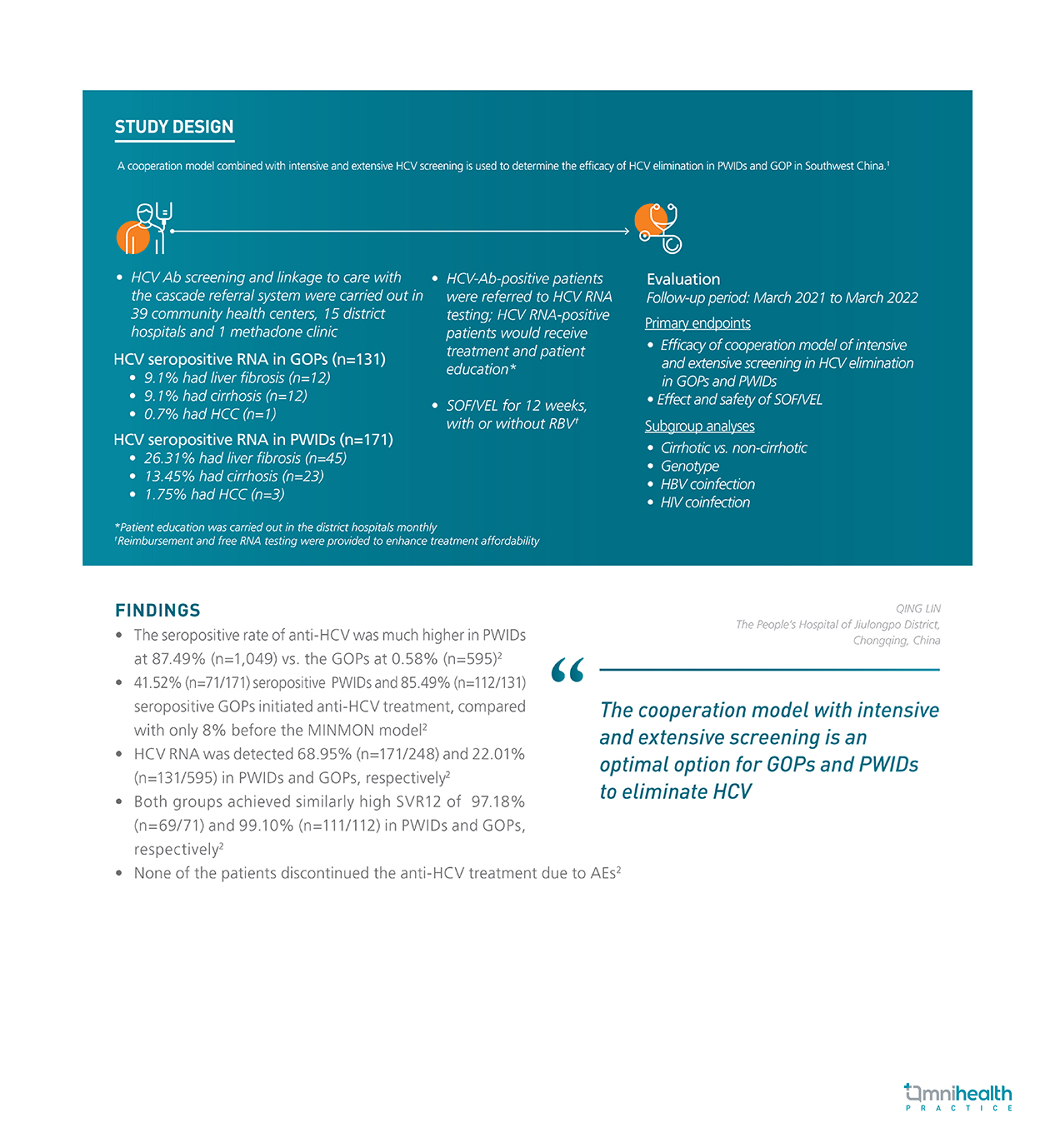- Lin Q, et al. From extensive to intensive screening, co-operations model of hepatitis C elimination in out-patients and people who inject drug population in southwest of China. Presented at: The International Liver Congress. 2022; 22-26 June 2022; London, UK.