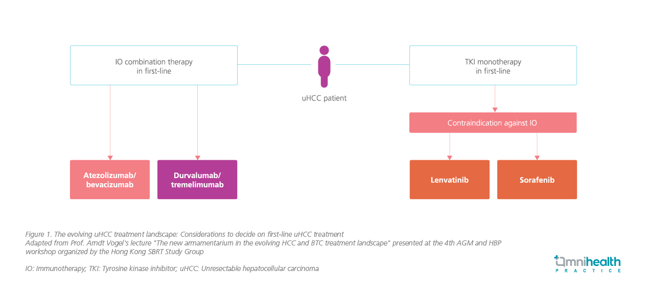 Multi-kinase inhibitors including sorafenib and lenvatinib were the first-line systemic treatment options for unresectable hepatocellular carcinoma (uHCC) patients, albeit with a median overall survival (OS) of around 1 year.1 Following the regulatory approval based on the significant OS improvement in 2020, atezolizumab + bevacizumab (atezo/bev) became a new and current standard of care (SoC) for uHCC.1 Despite the tremendous advancement, additional systemic treatment options with long-term efficacy and well tolerated safety profiles are still warranted to cater for individual medical needs of uHCC patients.2 Very recently, a novel immunotherapy (IO) combination (i.e., the STRIDE regimen) featuring a single high-priming dose of tremelimumab (TREME) [an anti-cytotoxic T-lymphocyte-associated antigen-4 (CTLA-4)] and every-4-week durvalumab (DUR) (anti-PD-L1) showed encouraging clinical efficacy and high tolerability in a phase 3 trial, becoming the latest addition to the armamentarium of first-line systemic treatment options for uHCC patients.2 In the 4th AGM and HBP workshop organized by the Hong Kong Stereotactic Body Radiation Therapy (SBRT) Study Group, Professor Arndt Vogel and Dr. Chiang, Chi-Leung presented new data and discussed the latest advancement in the rapidly evolving treatment landscape of uHCC. Subsequently in an interview with Omnihealth Practice, Dr. Chiang shared his insights into the new dual IO treatment option in uHCC. He also provided updates on the ongoing study START-FIT [transarterial chemoembolization (TACE) + SBRT + dual IO] with promising early results. At the end of the interview, he shared a clinical case which demonstrated the remarkable efficacy of SBRT + dual IO in a local uHCC patient.