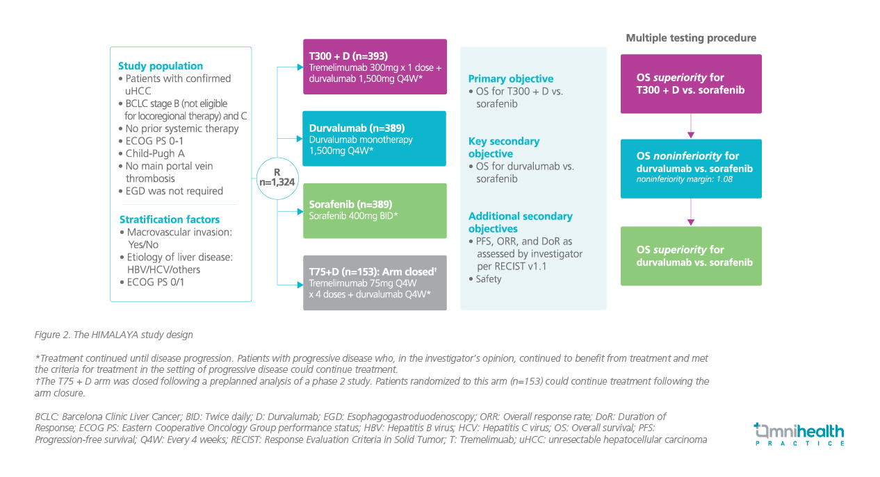 To evaluate the clinical efficacy of DUR + TREME in uHCC, a global, open-label, phase 3 HIMALAYA trial was conducted.2 This trial compared the survival benefits of DUR + a single priming dose of TREME vs. sorafenib among uHCC patients.2 Inclusion criteria for this trial were confirmed uHCC with Barcelona Clinic Liver Cancer (BCLC) stage B (but ineligible for locoregional therapy) or C, with no prior systemic therapy, and a classification of Child-Pugh Score class A.2 A total of 1,171 eligible patients were enrolled and randomized 1:1:1 to receive DUR + TREME, or DUR monotherapy, or sorafenib (figure 2).1
