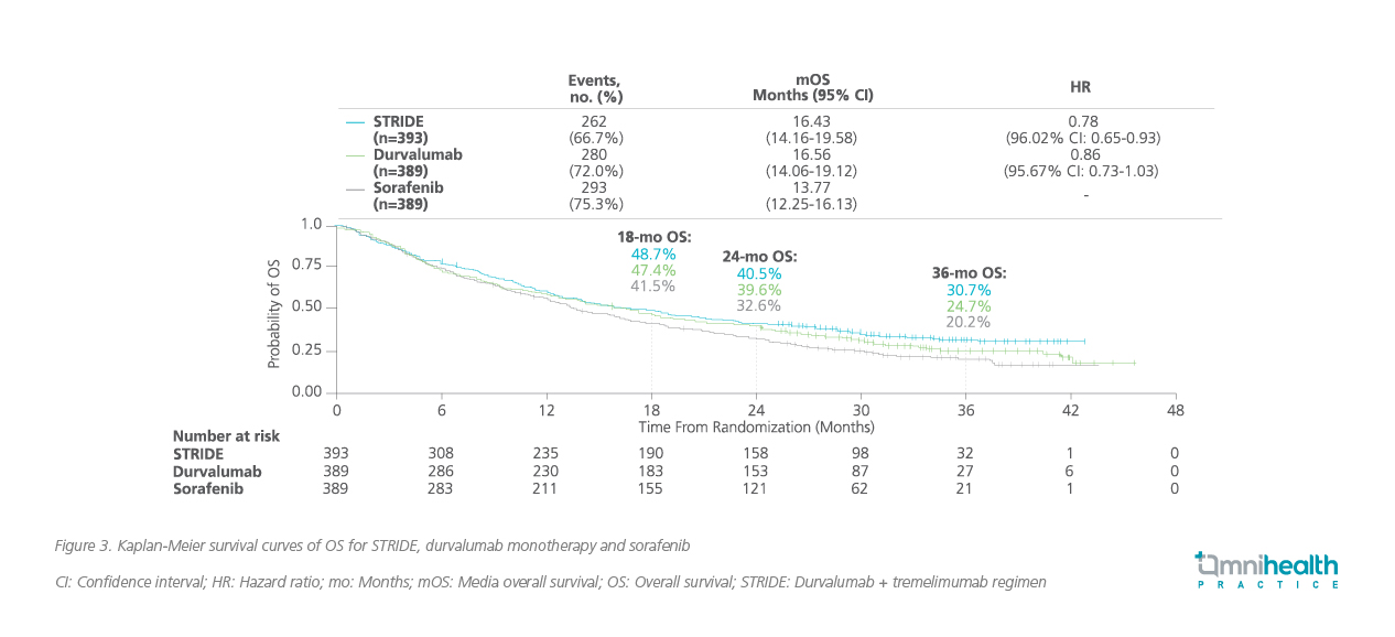 With a median follow-up of 33 months, DUR + TREME demonstrated a superior and prolonged median survival of 16.43 months vs. 13.77 months for sorafenib, with a relative OS risk reduction of 22% (HR=0.78; 96.02% CI: 0.65-0.93; p=0.0035) (figure 3).2 On the other hand, DUR monotherapy was also shown to be non-inferior to sorafenib for OS (median OS 16.56 months vs. 13.77 months; HR=0.86; 95.67% CI: 0.73-1.03).2 The 3-year OS rate was improved with DUR + TREME and DUR monotherapy when compared with sorafenib (30.7% vs. 24.7% vs. 20.2%).2 Of note, the 3-year OS results of the HIMALAYA trial revealed the plateauing of the tail in the Kaplan-Meier survival curves, indicating that patients who responded to DUR + TREME could achieve long-term survival.