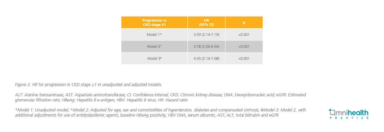The study also compared outcomes in 1,839 patients treated with ETV and 1,061 CHB control patients not receiving any treatment.6 A total of 354 patients in the ETV group and 63 patients in the untreated group developed progression in CKD stage ≥1 (3.2 vs. 1.2 per 1,000 PYs; p<0.001). This association was statistically significant even with the adjustment for potential confounders (aHR=2.37; 95% CI: 1.74-3.23; p<0.001).6
