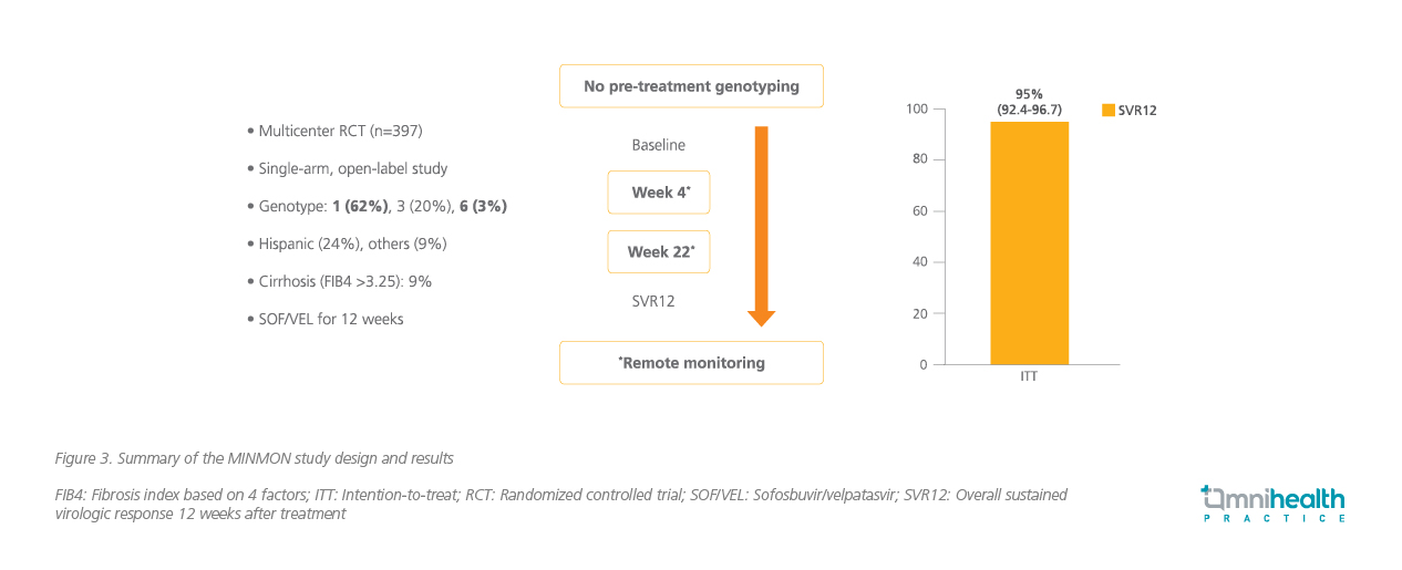 Dr. Wong stressed that it is necessary to simplify the treatment in order to screen and treat more patients at the same time, thus achieving the WHO goal of HCV elimination. Therefore, the MINMON study, a phase 4, open-label, single-arm, multinational trial, was conducted to examine the efficacy and safety of a minimal monitoring approach of delivering interferon-free and ribavirin-free, pan-genotypic DAA to treatment-naïve patients with active HCV infection defined as ribonucleic acid (RNA) >1,000IU/mL.10 This study specifically included countries from low-to-middle income countries, such as Brazil and Thailand.10 All included patients received a single tablet of fixed-dose combination of SOF 400mg/VEL 100mg taken orally once daily for 12 weeks, and they were only physically reviewed at baseline and SVR12, then the visit was replaced by simple monitoring using phone call or email to assess the patient’s compliance and presence of adverse event during the treatment.10