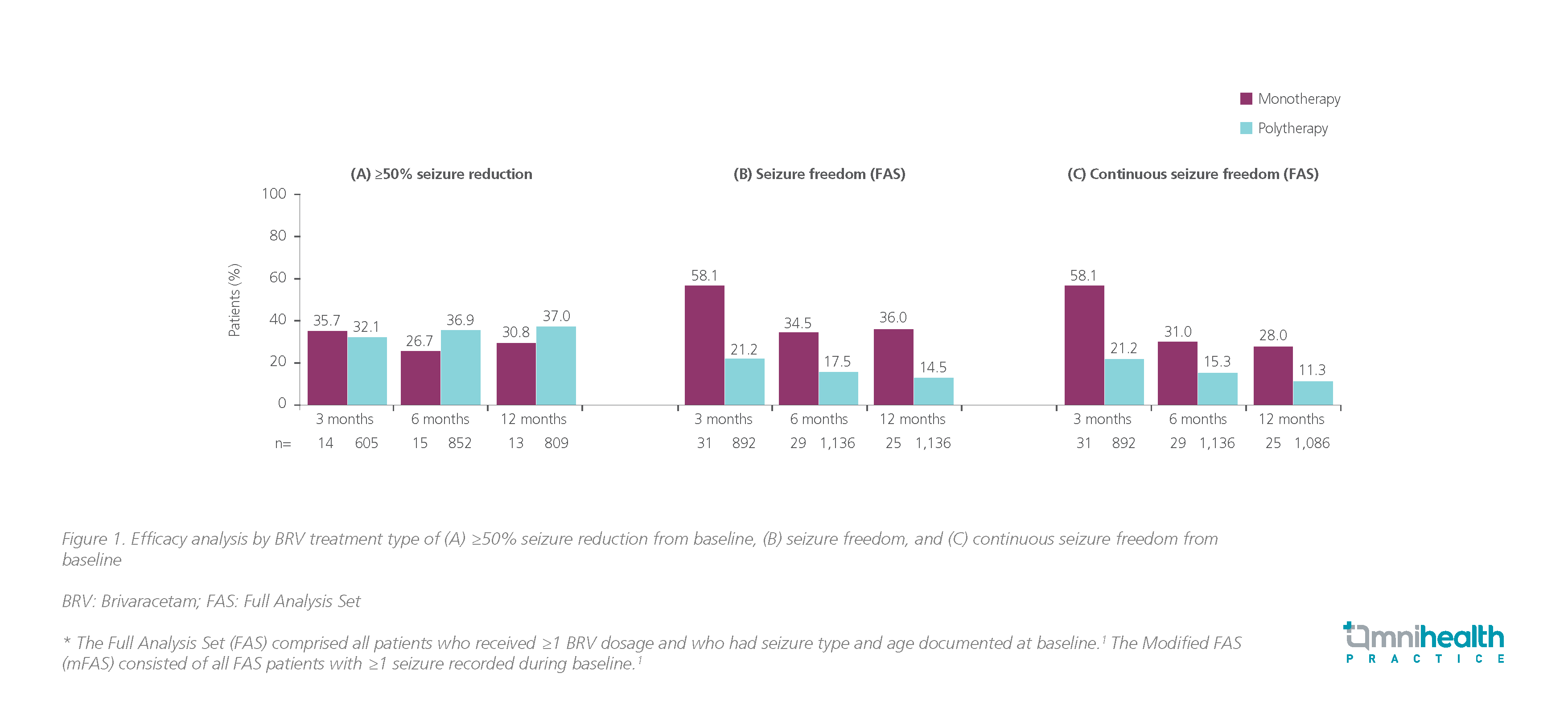 The EXPERIENCE/EPD332 study assessed the effectiveness and tolerability of BRV in patients with epilepsy by the number of prior ASMs and BRV treatment type. Of 1,644 patients included in the treatment type study, at 3, 6 and 12 months, compared with polytherapy patients, monotherapy patients had numerically higher seizure freedom (58.1% vs. 21.2%, 34.5% vs. 17.5%, 36.0% vs. 14.5%, respectively, p-value not available) and continuous seizure freedom rates (58.1% vs. 21.2%, 31.0% vs. 15.3%, and 28.0% vs. 11.3%, respectively, p-value not available), indicating patients with epilepsy receiving BRV monotherapy responded more effectively, although clinically meaningful continuous seizure freedom was also observed in the polytherapy patients.1 There were no discernible numerical differences in ≥50% seizure reduction at 3, 6 and 12 months between monotherapy and polytherapy patients (35.7% vs. 32.1%, 26.7% vs. 36.9%, and 30.8% vs. 37.0%, respectively) (figure 1).1