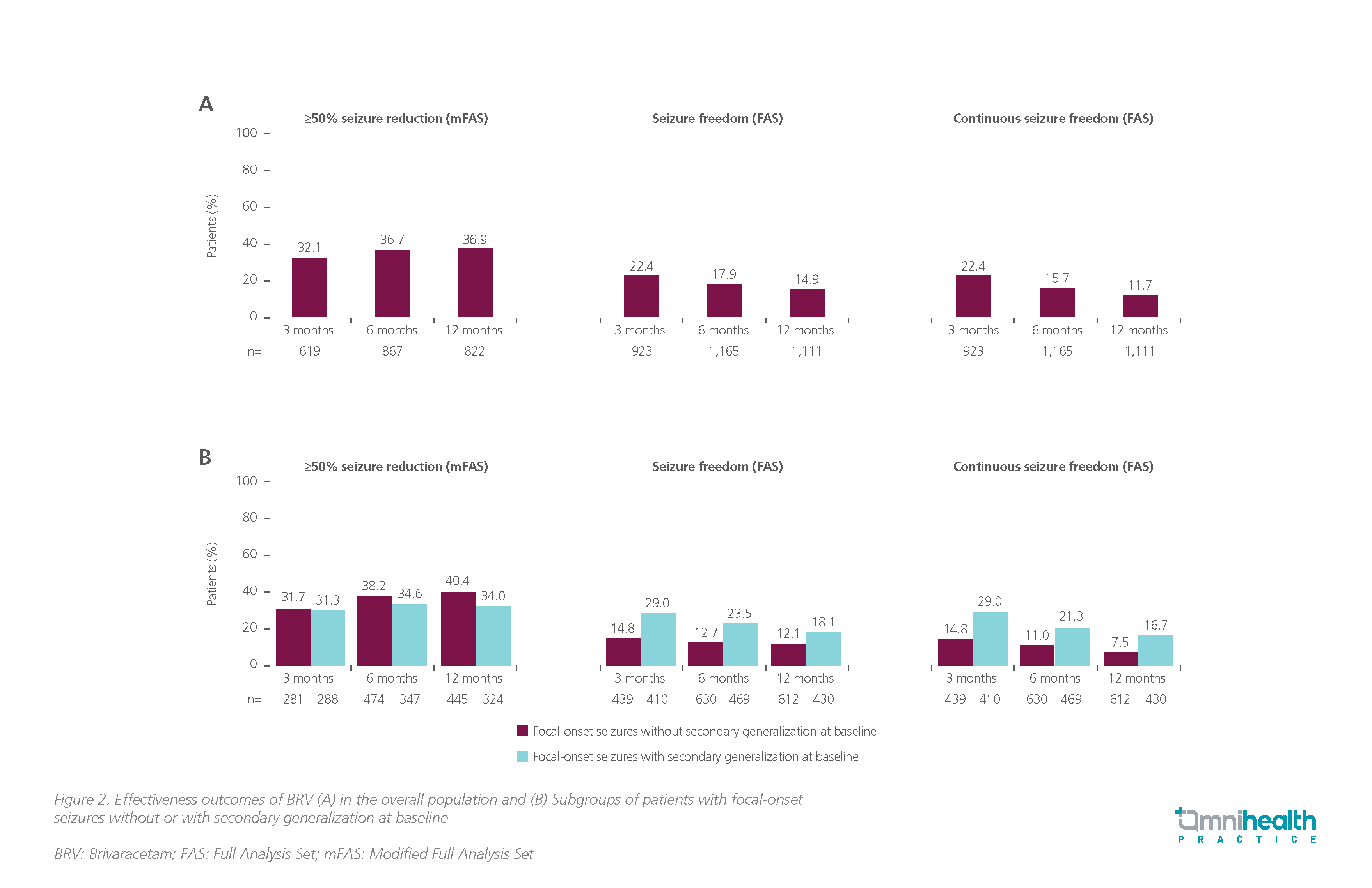 According to this pooled analysis, BRV was effective and well tolerated in routine clinical practice, with an 12-month ≥50% seizure reduction of 36.9, continuous seizure freedom of 11.7% and tolerability of 9.3%.3 In the overall BRV treatment population, 32.1%, 36.7% and 36.9% achieved ≥50% seizure reduction at 3, 6 and 12 months respectively; seizure freedom was achieved by 22.4%, 17.9% and 14.9%, and continuous seizure freedom was achieved by 22.4%, 15.7% and 11.7%, respectively (figure 2A).3 Of 1,150 patients with focal-onset seizures and seizure subtype data, 475 (41.3%) had focal-onset seizures without secondary generalization and 675 (58.7%) had focal-onset seizures with secondary generalization.3 Effectiveness outcomes at 3, 6 and 12 months were comparable between the subgroups (≥50% seizure reduction: 31.7% vs. 31.3%, 38.2% vs. 34.6%, and 40.4% vs. 34.0%, respectively; seizure freedom: 14.8% vs. 29.0%, 12.7% vs. 23.5%, and 12.1% vs. 18.1%, respectively; continuous seizure freedom: 14.8% vs. 29.0%, 11.0% vs. 21.3%, and 7.5% vs. 16.7%, respectively) (Figure 2B).3 No new safety concerns were observed. Consistent with prior BRV studies, the 4 most common TEAEs reported by ≥3% of patients at any timepoint were fatigue, dizziness, irritability, and somnolence, demonstrating that BRV was effective and well tolerated even in highly drug-resistant patients.3