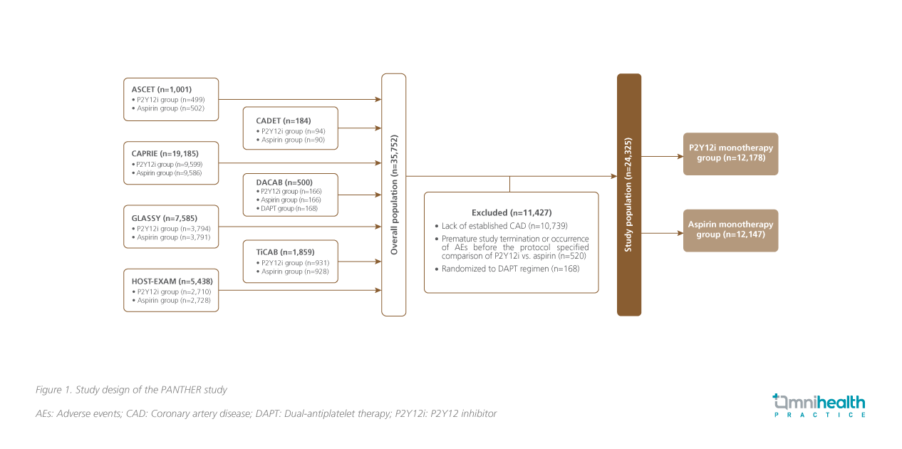 The PANTHER study, a meta-analysis of 7 randomized trials, suggested that the use of P2Y12 inhibitor (P2Y12i) monotherapy was associated with a 12% reduction in the risk of the primary composite endpoint of cardiovascular (CV) death, myocardial infarction (MI) or stroke when compared with aspirin monotherapy for the secondary prevention in patients with established coronary artery disease (CAD).1 It was also associated with a 23% relative reduction in the risk of MI. Notably, there was no increased risk of bleeding with P2Y12is vs. aspirin monotherapy.1