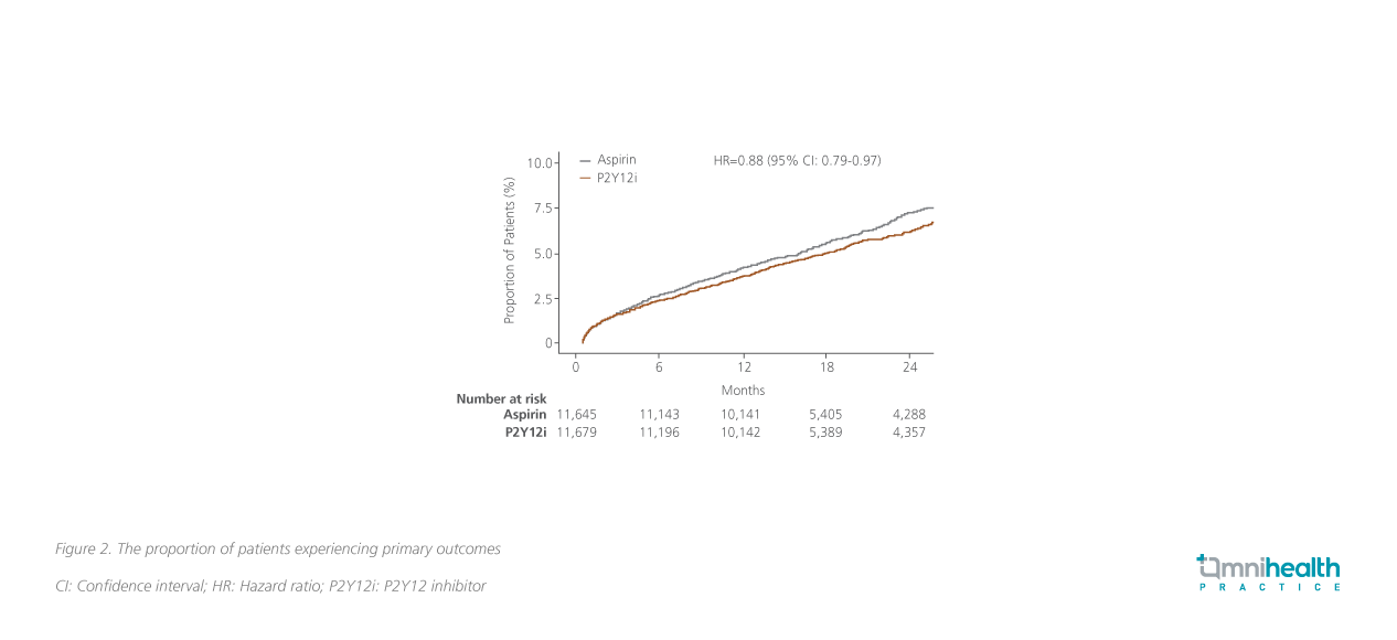 In the P2Y12i group, 62% received clopidogrel, and 38% received ticagrelor.1 The mean age of patients was 64.3 years, and 23.7% were Asians.1 Around 23.9% of patients were prescribed with proton-pump inhibitors (PPIs).1 The median treatment duration was 557 days.1 The primary efficacy outcome was a composite of CV death, MI and stroke.1 The pre-specified secondary outcomes were major bleeding and net adverse clinical events.1 Other secondary outcomes were the individual components of the primary outcome, all-cause mortality, ischemic or hemorrhagic stroke, defined and/or probable stent thrombosis, and gastrointestinal (GI) bleeding.1