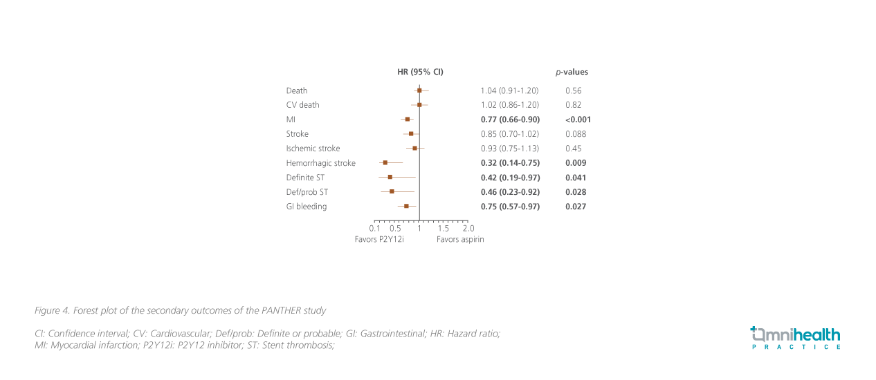 Regarding the secondary outcomes, both groups showed a comparable risk of major bleeding, with major bleeding events observed in 1.2% of patients receiving the P2Y12i monotherapy vs. 1.4% of those receiving the aspirin monotherapy (HR=0.87; 95% CI: 0.70-1.09; p=0.23) (figure 3).1 In addition, the P2Y12i monotherapy was shown to be associated with a 23% reduction in the risk of MI compared with the aspirin monotherapy, with these events occurring in 2.3% receiving the P2Y12i monotherapy and 3.0% receiving the aspirin monotherapy (HR=0.77; 95% CI: 0.66-0.90; p<0.001) (figure 4).1Additionally, the P2Y12i monotherapy also showed potential reductions in the risk of hemorrhagic stroke (HR=0.32; 95% CI: 0.14-0.75; p=0.009) and GI bleeding (HR=0.75; 95% CI: 0.57-0.97; p=0.027) when compared with the aspirin monotherapy (figure 4).1