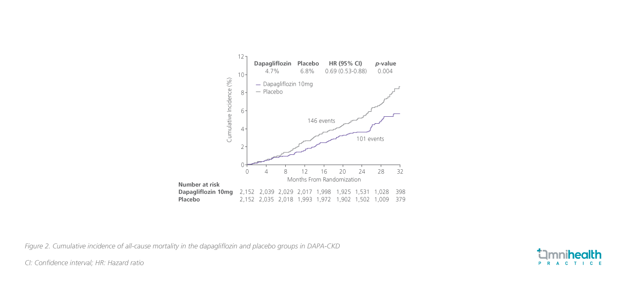 After a median follow-up of 2.4 years, results showed that dapagliflozin significantly reduced the risk of the primary composite outcome of sustained ≥50% decline in eGFR, ESKD, or death from renal or CV causes among CKD patients with a relative risk reduction of 39% (HR=0.61; 95% CI: 0.51-0.72; p<0.001)(figure 1).9 Regarding all-cause mortality, a secondary outcome ofDAPA-CKD, dapagliflozin achieved a 31% relative risk reduction vs. placebo (HR=0.69; 95% CI: 0.53-0.88; p=0.004) (figure 2).9 The incidences of AEs of dapagliflozin were similar to those in the placebo group.9 The rate of major hypoglycemia in the dapagliflozin group was lower than that in placebo group, and there were no hypoglycemic episodes in patients without diabetes.9,10