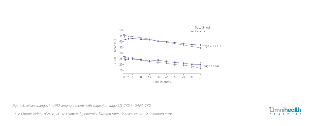 The clinical efficacy of dapagliflozin in stage 4 CKD patients was demonstrated in a post-hoc analysis of DAPA-CKD.5 Regarding the effects on the eGFR slopes, dapagliflozin attenuated progressive decline of eGFR in patients with stage 4 CKD and achieved a between-groups difference of 1.23mL/min/1.73m2 per year(95% CI: 0.36-2.09; p=0.005) vs. placebo, which was consistent with the effect among patients with stage 2/3 CKD (pinteraction=0.48)(figure 3).5 Overall, stage 4 CKD patients tolerated dapagliflozin well.5 The rates of serious AEs or AEs of interest, including renal-relatedAEs, major hypoglycemia or volume depletion, were also similar among patients treated with placebo.5