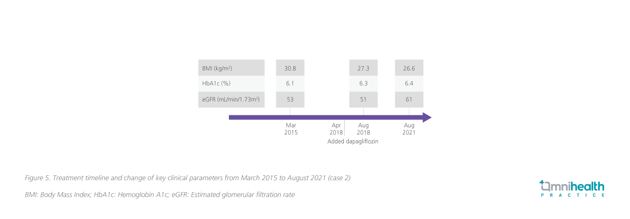 An 87-year-old, functionally independent, overweight lady had a past medical history of hypertension, hypercholesterolemia, hyperuricemia, multiple minor strokes, congestive heart failure, gout, T2D, depression, osteoporosis, insomnia, dementia, and rapid eye movement (REM) sleep disorder. With these multiple comorbidities, she had been treating with 14 medications. In 2015, her eGFR was 53mL/min/1.73m2 (i.e., stage 3 CKD), and was treated with irbesartan for her hypertension. In 2018, the issue of getting overweight with this patient became worse, with her body mass index (BMI) reaching 30.8kg/m2. Dapagliflozin was started for further control on T2D in early 2018, before it was approved as CKD treatment. The patient's overweight issue improved during the first 4 months of treatment, with eGFR of 51mL/min/1.73m2. Over 3 years of treatment, Dr. Shea was surprised that the patient’s eGFR started to rebound and increase gradually to 61mL/min/1.73m2 in 2021, which has been sustained as of today (figure 5). The patient tolerated the drug well with no reports of AEs.