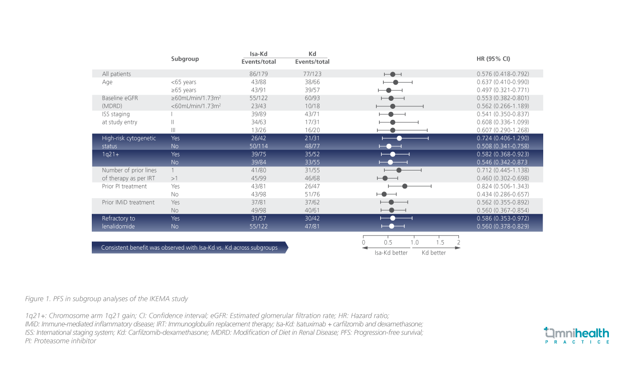 With these updated data, Isa-Kd has demonstrated one of the longest PFS results with a PI-based backbone in the relapsed MM setting, with 42% reduction vs. Kd in the risk of progression or death (HR=0.58; 95.4% CI: 0.42-0.79).10 The subgroup analysis showed a consistent benefit across all subgroups including patients with high-risk cytogenetic status, Chromosome arm 1q21gain (1q21+), and refractoriness to lenalidomide (figure 1).9 With regard to all 1q+ subgroups, Isa-Kd also demonstrated significant improvement in median PFS and response rates.9"