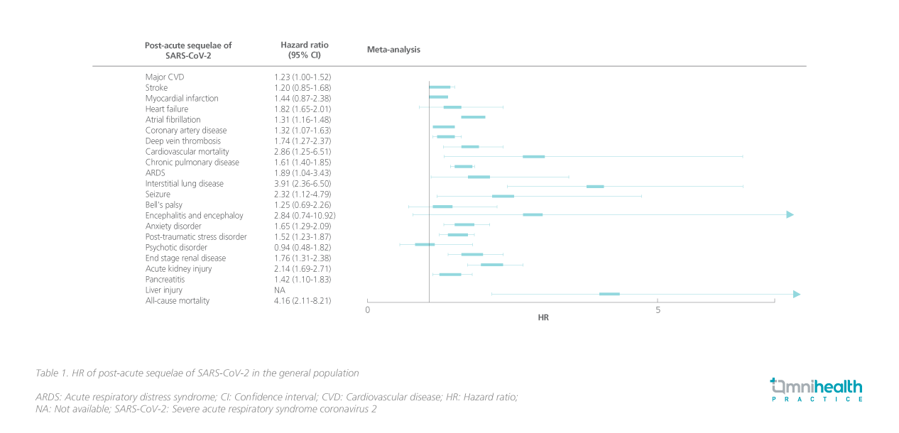 Additionally, a retrospective, multi-database cohort study in Hong Kong and the United Kingdom identified previous COVID-19 infection as a risk factor for diseases involving multiple organ systems during the post-acute phase of infection.3 For instance, COVID-19 patients had an 82% significantly greater risk for heart failure (HF), 74% for deep vein thrombosis (DVT), 61% for chronic pulmonary disease, 65% for anxiety disorder, 76% for end-stage renal disease (ESRD), and 42% pancreatitis (table 1).3 They also had a much higher risk for cardiovascular events (HR=2.86; 95% CI: 1.25-6.51) and all-cause mortality (HR=4.16; 95% CI: 2.11-8.21).3