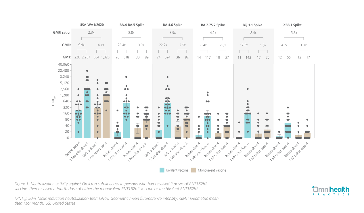 Nonetheless, since bivalent BNT162b2 contains mRNA that encodes the S-gene from the ancestral strain and Omicron BA.4/BA.5 while XBB and XBB.1.5 are descendants of the Omicron BA.2 sub-lineage, there were concerns about the potential reduction in the VE of bivalent BNT162b2 against these predominant subvariants.12 Yet, a recent immunogenicity study has indicated that the bivalent vaccine elicited several times higher neutralizing titers when compared with the ancestral strain vaccine against the BA.2.75.2, BQ.1.1 and XBB.1 sub-lineages (figure 1).13 The findings suggested that the bivalent vaccine was much more immunogenic, supporting its use in real-world practice.