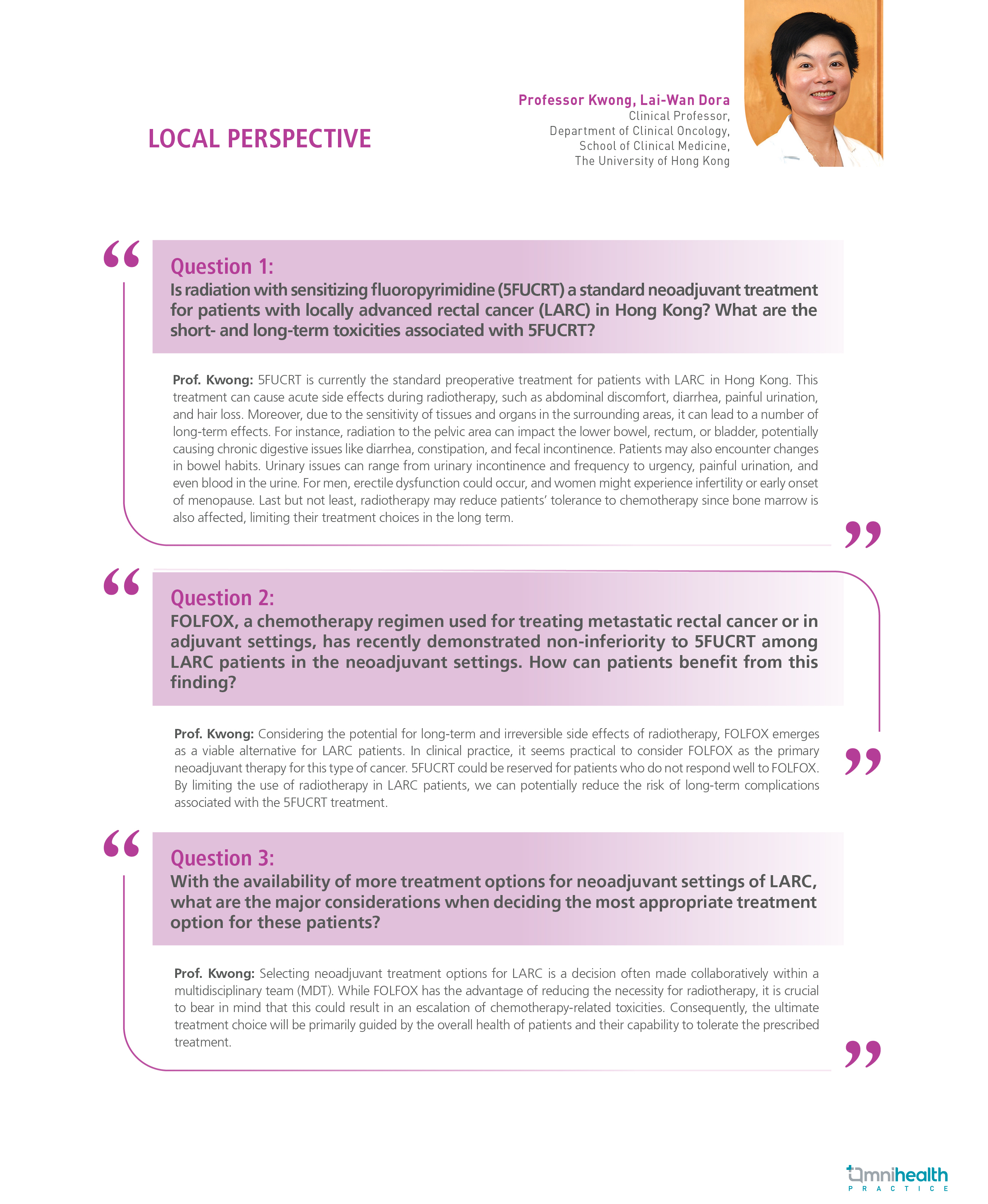 Globally, rectal cancer is a major health issue, with about 800,000 new cases diagnosed in 2023 alone, of which around half have been proven to be locally advanced.1 Neoadjuvant pelvic chemoradiation (CRT) in combination with either fluorouracil (5FU) or capecitabine followed by a total mesorectal excision (TME) has become the accepted standard of care for the past 2 decades.1 Although it is effective in providing curative intent, there is a plethora of toxicities that come from pelvic CRT including impaired bowel, bladder, and sexual function, in addition to an increased risk of pelvic fracture and secondary malignancies, impaired marrow reserves, as well as links to infertility and premature menopause.1 Advancement in chemotherapy regimens has given birth to other options over the last 2 decades such as FOLFOX (i.e., leucovorin calcium, 5FU, and oxaliplatin).1 In ASCO 2023, Professor Deborah Schrag from Weill Cornell Medicine, the United States (US), shared her team’s results of the PROSPECT trial.1