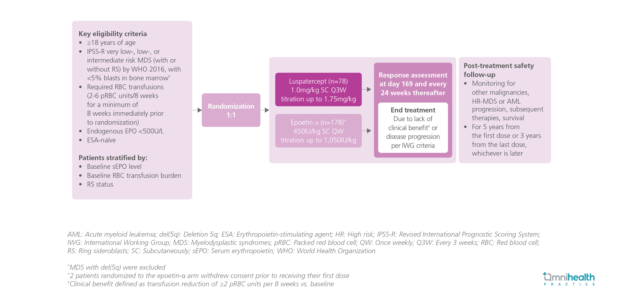 The COMMANDS study was a global, phase 3, open-label, randomized trial designed to compare the efficacy and safety of luspatercept against epoetin-α for the treatment of anemia in erythropoiesis-stimulating agent (ESA)-naïve adult patients with transfusion-dependent low-risk MDS, as defined by the Revised International Prognostic Scoring System (IPSS-R).1 The patients were randomized 1:1 to receive luspatercept (n=178) 1mg/kg every 3 weeks (Q3W) or epoetin-α (n=176) 450IU/kg once weekly (QW).1 The composite primary endpoint was red blood cell (RBC) transfusion independence (TI) and concurrent mean hemoglobin (Hb) increase of ≥1.5g/dL.1 The secondary endpoints were hematologic improvement-erythroid (HI-E) response ≥8 weeks by the International Working Group (IWG) criteria, RBC-TI for ≥12 weeks, and RBC-TI at 24 weeks.1 The results were reported in the prespecified interim analysis of the first 24 weeks.