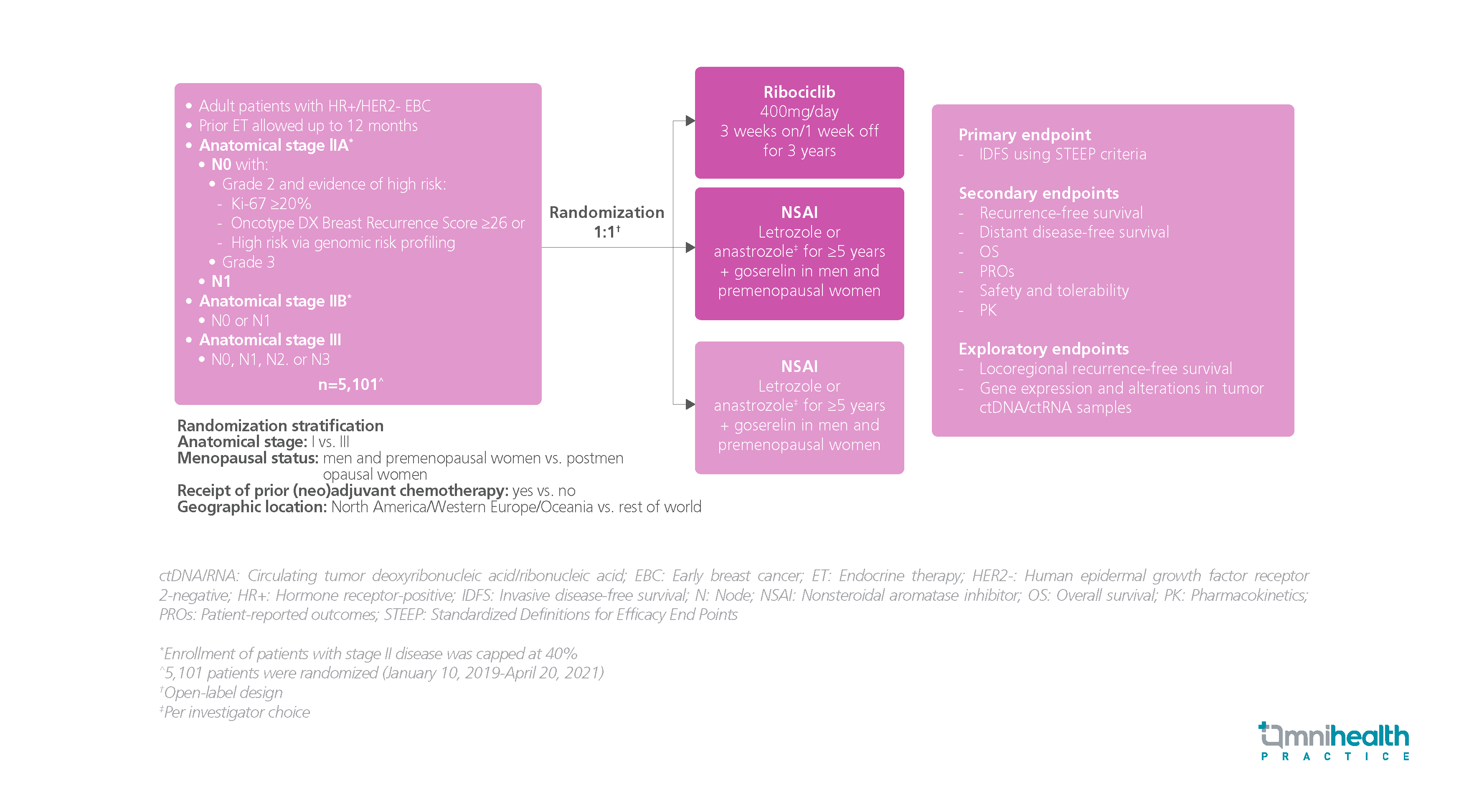 The NATALEE trial was a randomized, controlled study designed to investigate the safety and efficacy of adjuvant ribociclib + ET in patients with HR+, HER2- stage IIA-III EBC, including those without nodal involvement.1 A total of 5,101 participants were recruited and randomized 1:1 to receive either ribociclib and nonsteroidal aromatase inhibitor (NSAI) (n=2,549) or NSAI alone (n=2,552).1 Ribociclib 400mg was given once daily (QD) on a “3 weeks on, 1 week off” schedule with a treatment duration of 3 years, while NSAI was given as the investigator’s choice of letrozole or anastrozole for ≥5 years with the addition of goserelin for men and premenopausal women.1 The primary endpoint was invasive disease-free survival (IDFS).1 The key secondary endpoints included recurrent-free survival, distant disease-free survival (DDFS), overall survival (OS), and safety, etc.1