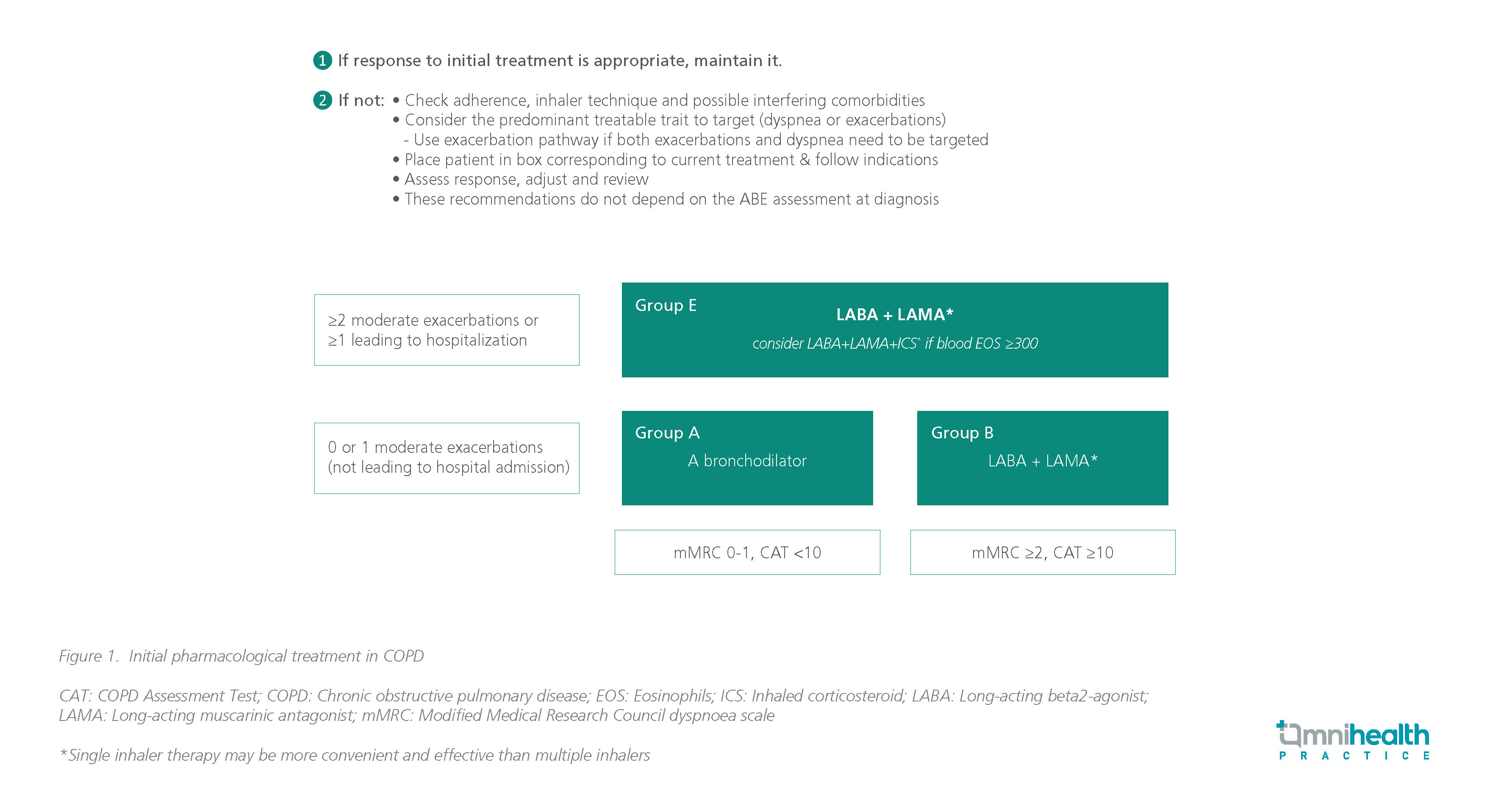 Currently, initial management includes lifestyle modifications, pharmacotherapy, education on the management plan and inhaler technique, as well as the management of comorbidities.1 Reviewing the patient’s symptoms, mainly dyspnea and exacerbations, is essential and should be followed by an assessment of the patient’s inhaler technique, compliance and non-pharmacological approaches before considering treatment adjustment.1