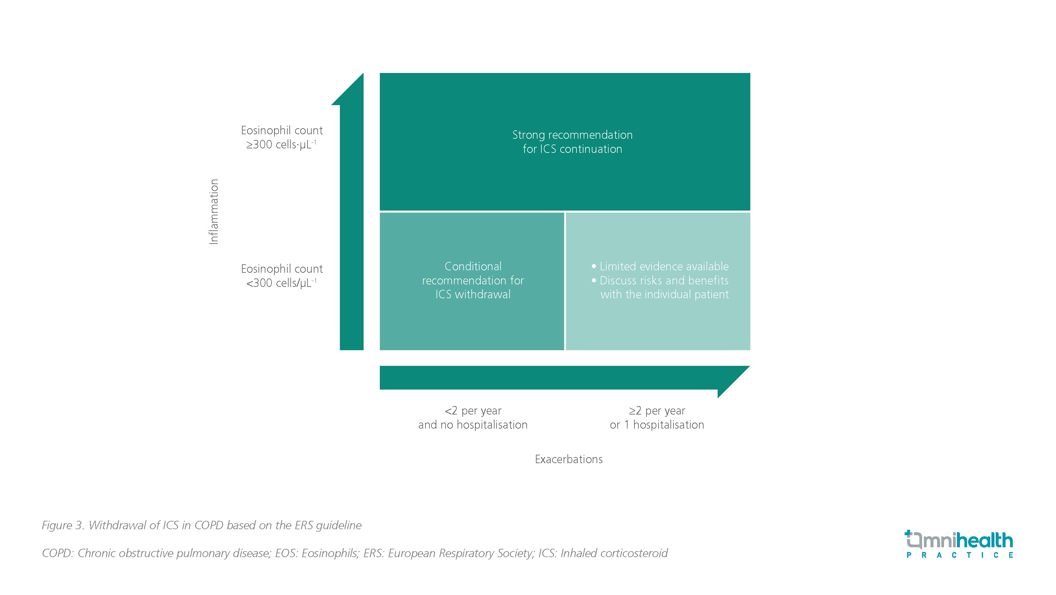 Based on the 2020 European Respiratory Society (ERS) guidelines, ICS should be withdrawn in patients with EOS counts <300cells/μL and <2 exacerbations per year without hospitalization.9 However, ICS should not be withdrawn in patients with blood EOS ≥300cells/μL, with or without a history of frequent exacerbations or hospitalizations.9 Limited evidence on ICS withdrawal is available for patients with EOS <300cells/μL and ≥2 exacerbations per year or 1 hospitalization (figure 3).9