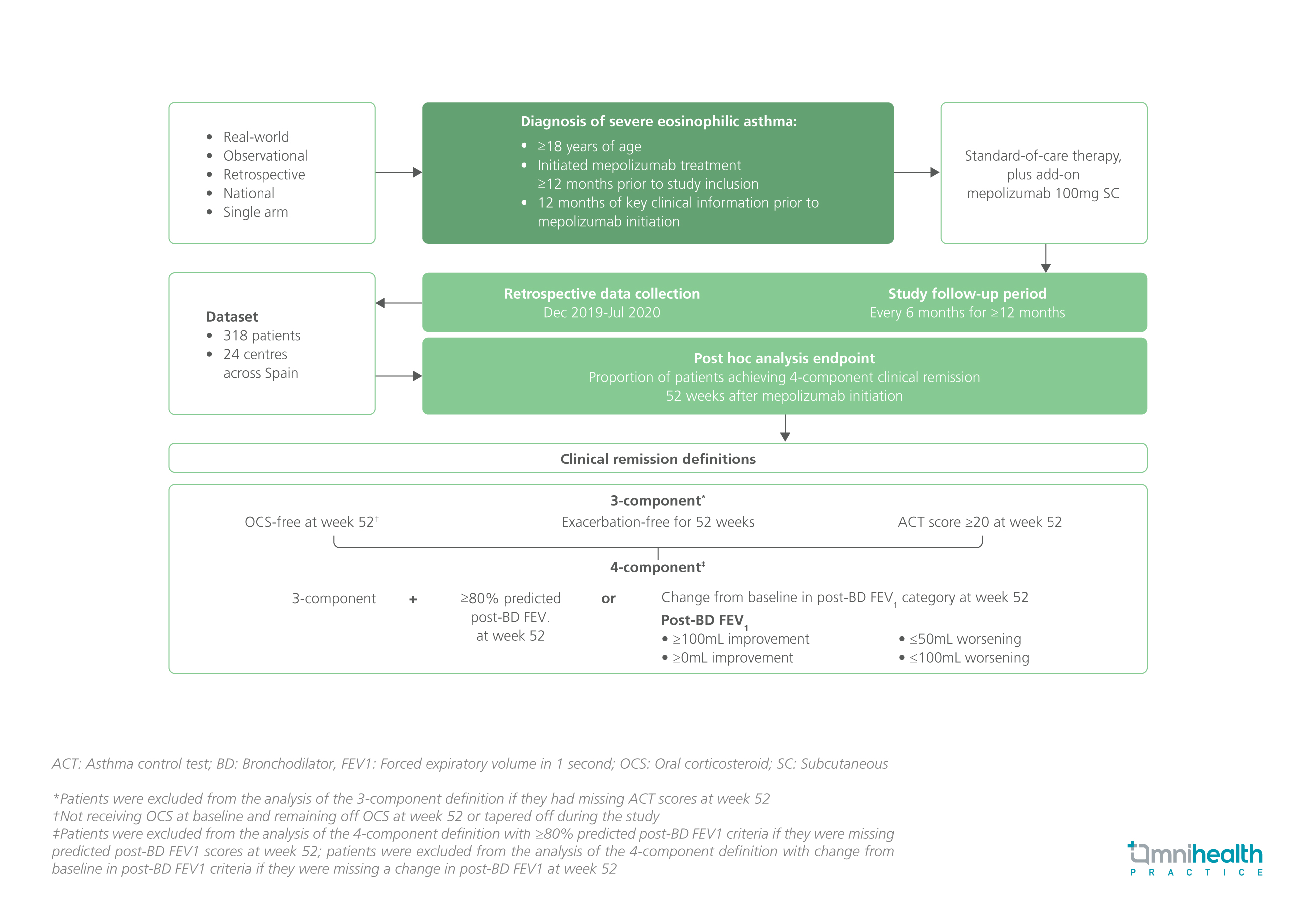 The primary endpoint of the post-hoc analysis was the proportion of patients achieving 4-component clinical remission 52 weeks after mepolizumab initiation which included oral corticosteroid (OCS)-free, exacerbation-free, Asthma Control Test (ACT) score ≥20, and one of the prespecified lung function parameters.1
