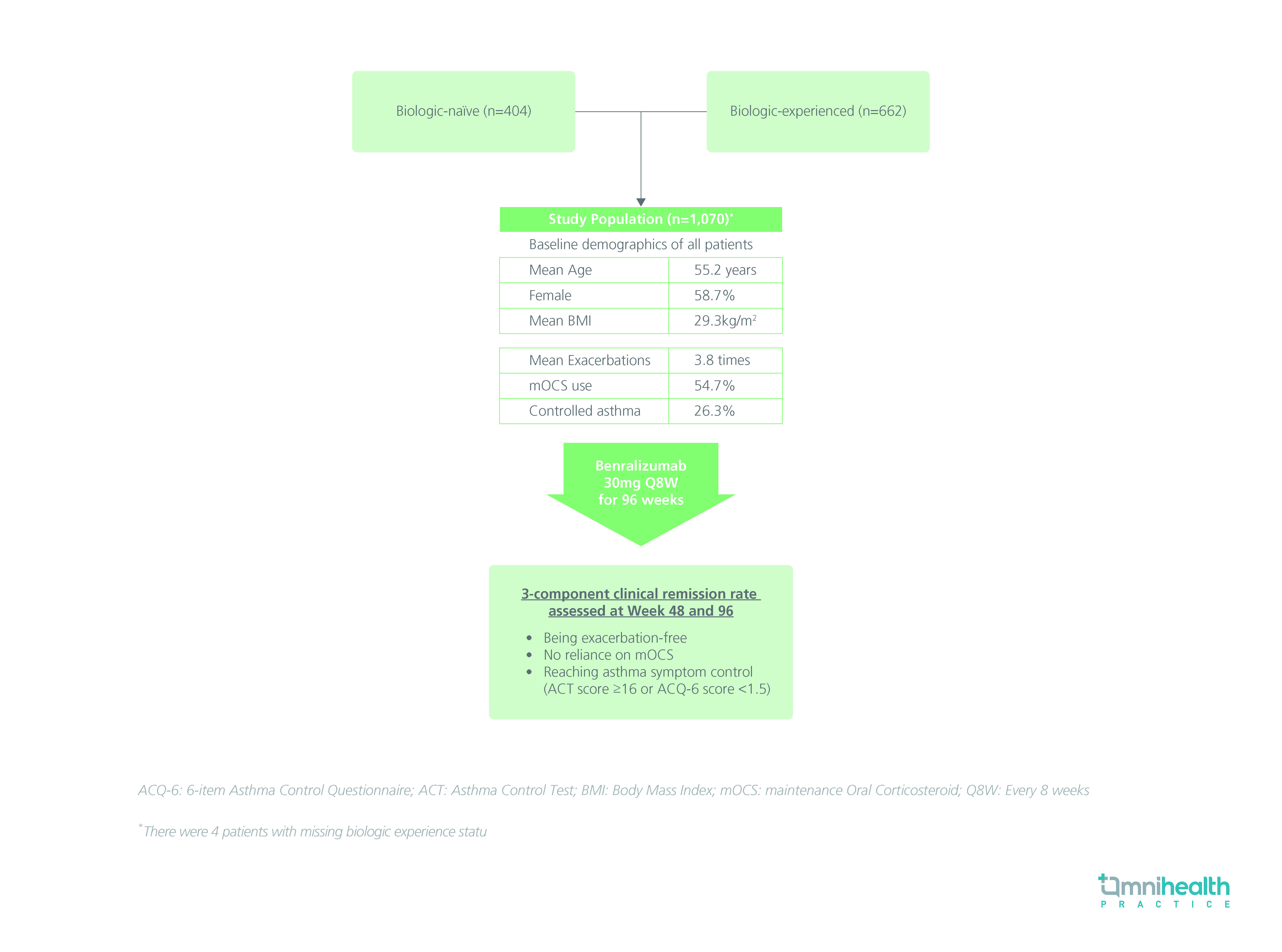 The study population was then given benralizumab 30mg for every 8 weeks (Q8W) and was followed-up for 96 weeks.1 The primary clinical outcome of this study was a 3-component clinical remission rate assessed at weeks 48 and 96.1 The 3 components included being exacerbation-free, no mOCS use, and maintaining symptomatic control of their asthma (ACT score ≥16 or ACQ-6 score <1.5).1