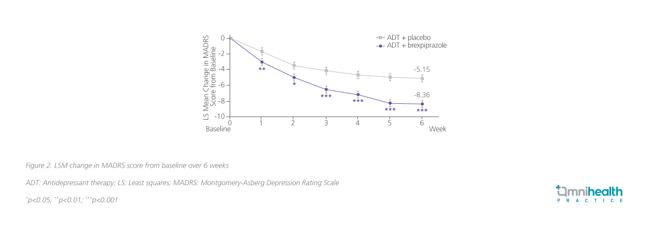 After an in-depth discussion with the patient, Dr. Li recognizes that she has a strong desire to resume her vocational functions. Thase ME, et al conducted a study in 2015 in which patients with inadequate response to 1-3 previous lines of ADT were randomized to receive brexpiprazole 2mg QD or a matching placebo on top of their ADT.8 They found a significant (p=0.0002) reduction in least squares (LS) mean change in Montgomery-Asberg Depression Rating Scale (MADRS) score by an additional 3.21 points at 6 weeks of treatment (figure 2).8