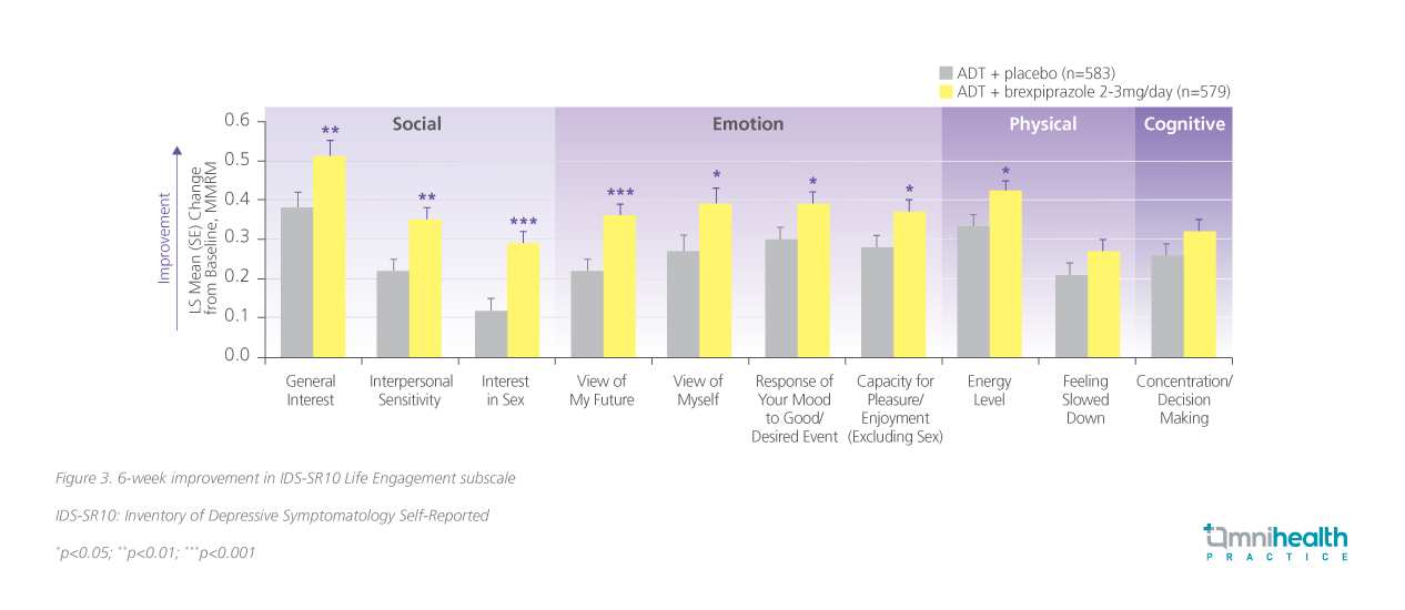 In another study conducted by McIntyre RS, et al where the effects of adjunctive brexpiprazole on life engagement in MDD patients showed that brexpiprazole augmentation offered significantly greater improvement over placebo in terms of the Inventory of Depressive Symptomatology Self-Report (IDS-SR10) Life Engagement subscale over 6 weeks (LS mean = -1.19; 95% CI: -1.78 to -0.59; p<0.0001) (figure 3).10 The Life Engagement subscale consisted of 10 items including the response of mood to good or desired events, concentration and decision making, view of oneself, view of one’s future, general interest, energy level, capacity for enjoyment or pleasure, interest in sex, feeling slowed down, and interpersonal sensitivity.10 Short-term results of the pooled analysis from 3 randomized double-blinded trials of ADT + brexpiprazole 2-3mg* QD (n=579) and ADT only (n=583), were recorded at 6 weeks post-treatment initiation, and long-term results were reported in an open-label extension of up to 52 weeks.10 Notably, at each weekly follow-up visit, statistically significant improvement in the placebo group were maintained consistently (p<0.01).10 In the extended study period, the mean improvement persisted in across all 10 Life Engagement items, with a 2.4 points improvement at week 26 and a 3.7 points improvement at week 52 respectively.10