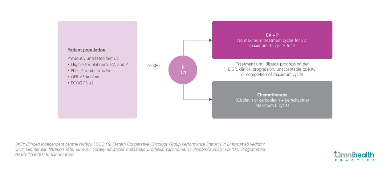 The study recruited 886 patients with previously untreated la/mUC and randomized them 1:1 to either receive EV+P for a maximum of 35 cycles (n=440) or CTx (cisplatin or carboplatin + gemcitabine) for a maximum of 6 cycles (n=433).1 Patients were treated until disease progression, unacceptable toxicity, or completion of maximum cycles.1 Key demographic and baseline disease characteristics were balanced between treatment arms and representative of the 1L la/mUC population.1