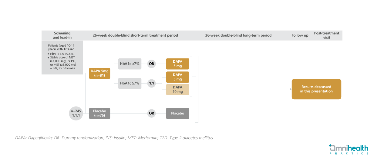 In this study, T2D patients who were aged 10-17 years, had a hemoglobin A1c (HbA1c) level of 6.5-10.5% and received prior treatment of metformin and/or insulin for ≥8 weeks were randomized to receive a daily dose of DAPA 5mg (n=81) or placebo (n=76).1 The DAPA group was further assessed at Week 14 for their HbA1c levels.1 Patients with a HbA1c level <7% continued receiving dapagliflozin 5mg daily, whereas patients with a HbA1c level ≥7% were randomized to receive dapagliflozin 5mg or 10mg daily.1 After the primary endpoint assessment at week 26, the respective treatment of each group was continued until week 26.1