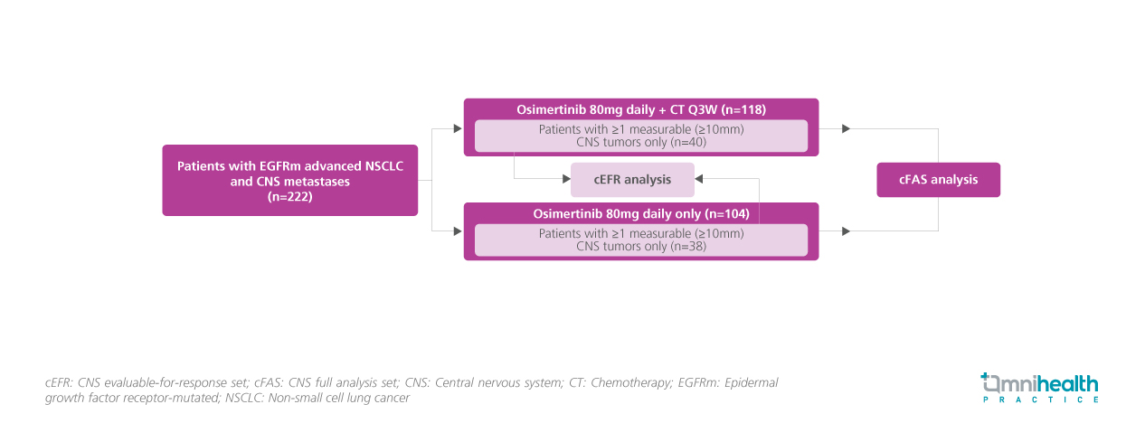 The phase 2 FLAURA2 study found that first-line combination of osimertinib and chemotherapy (CT) offered significant survival benefits among patients who were diagnosed with epidermal growth factor receptor-mutated (EGFRm) advanced non-small cell lung cancer (NSCLC) compared to first-line osimertinib monotherapy.1 Considering that a majority of patients with EGFRm NSCLC may develop metastasis in other areas of the body such as the central nervous system (CNS), an exploratory analysis based on the patient demographic of the FLAURA2 study was initiated to explore the clinical efficacy of osimertinib combined with CT among EGFRm NSCLC patients who had developed CNS tumors.1
