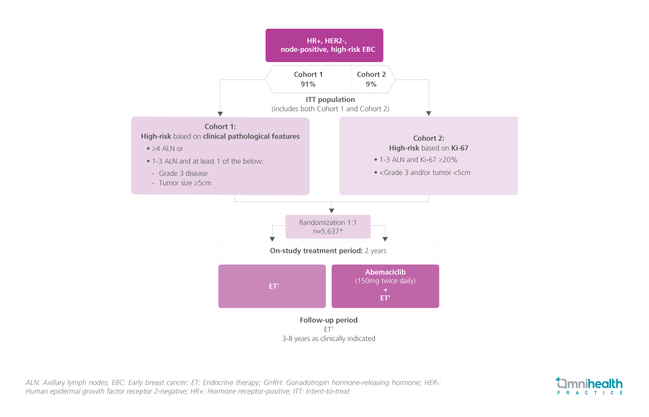 5,637 eligible patients with HR+, HER2-, node-positive, high-risk EBC who were classified as high-risk based on either clinical pathological features (≥4 axillary lymph nodes or grade 3 disease or tumor size ≥5cm) (n=5,120) or the Ki-67 index (<4 axillary lymph nodes and Ki-67 ≥20%) (n=517) were recruited and randomized to receive abemaciclib (150mg twice daily) + ET or ET alone for 2 years.1 After the 2-year on-study treatment period, both arms received ET for an additional 3-8 years.1 At the latest data cutoff date (3 July 2023), the median follow-up was 54 months with more than 80% of patients being followed up for at least 2 years since completing the course of abemaciclib.1