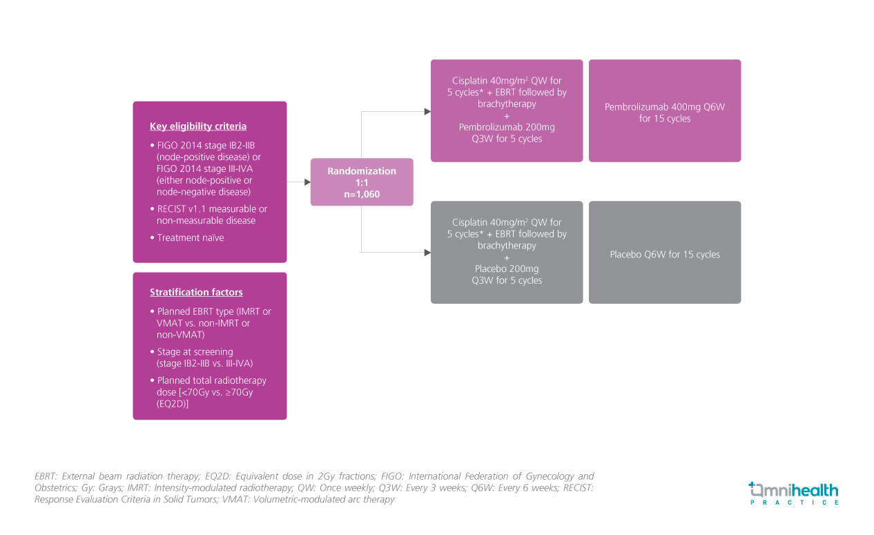 In this randomized, double-blinded, multicentre phase 3 study, 1,060 patients with either stage IB2-IIB (node-positive) or stage III-IVA (either node-positive or negative) cervical cancer were enrolled across 176 sites in 30 countries.1 Patients were randomized to receive a CCRT regimen [cisplatin 40mg/m2 QW + external beam radiation therapy (EBRT) followed by brachytherapy] with either pembrolizumab 200mg (n=529) or placebo every 3 weeks (n=530) for 5 cycles. In addition, 15 cycles of pembrolizumab 400mg or placebo Q6W was offered as the maintenance therapy for their respective treatment groups.1