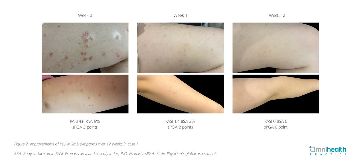 A 21-year-old woman with 4-year history of moderate (6% BSA) PsO, featuring plaques and scaling on torso, limbs and scalp, scored PASI 9.6 and ss-PGA 3 pre-treatment. Despite the ineffectiveness of prior topical and traditional Chinese medicine, she hesitated on the use of injections and was more inclined to receive oral medications in the discussion of treatment options. Deucravacitinib was initiated which led to complete clearance (PASI 0, BSA 0%, ss-PGA 0) after 12 weeks of treatment (figure 2).
