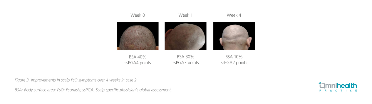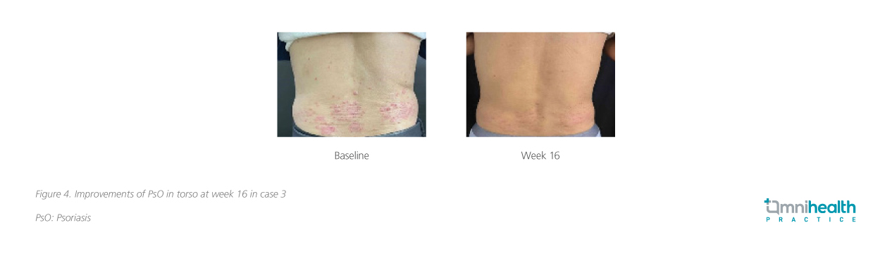 A 52-year-old man with a history of PsO of over 20 years presented with red patches of varying sizes throughout the body. He had received topical treatments such as vitamin D3 derivatives, corticosteroids and Chinese medicinal baths. He had also previously received IL-17A inhibitors such as secukinumab with resistance occurring after 2 years of treatment which led to severe recurrences on both lower limbs, scalp and arms. Before deucravacitinib treatment, he had a BSA of 40%, PASI score 25, sPGA score 5, and a scalp ss-PGA score of 4. BSA improved to 30% at week 1, and 10% at week 4, and an improvement to an ss-PGA score of 2 was achieved by week 4 (figure 3).