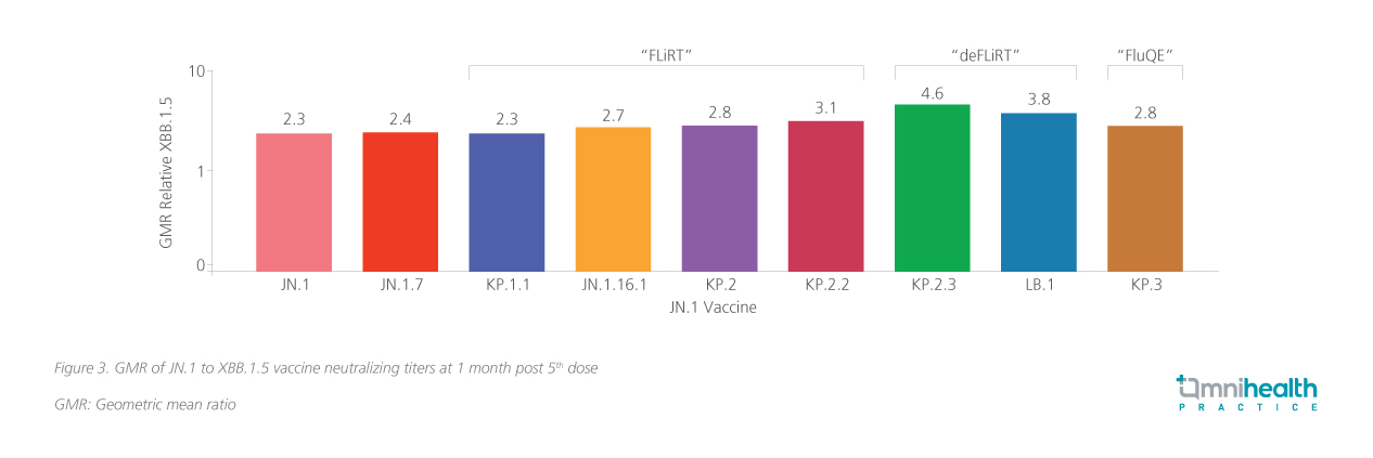 The BNT162b2 JN.1-adapted mRNA vaccine has demonstrated its efficacy against newer circulating variants.9 These studies indicate that this monovalent vaccine offers strong efficacy and cross-neutralization against multiple strains.9 Additional study involving healthcare workers further demonstrate significant boosts in neutralizing antibody levels – 2.2-fold against JN.1, 3.8-fold against KP.2, and 4.9-fold against LB.1.10 In vaccine-experienced populations, the BNT162b2 vaccine further demonstrated significant boosts in neutralizing antibody levels – 2.3-fold against JN.1, 2.8-fold against KP.2, 4.6-fold against KP.2.3, and 3.8-fold against LB.1 (figure 3).9 It has also been shown to boost neutralization of KP.3.1.1pp (geometric mean titer [GMT] reduction by 1.9-fold) and XEC (GMT reduction by 2.9-fold).11