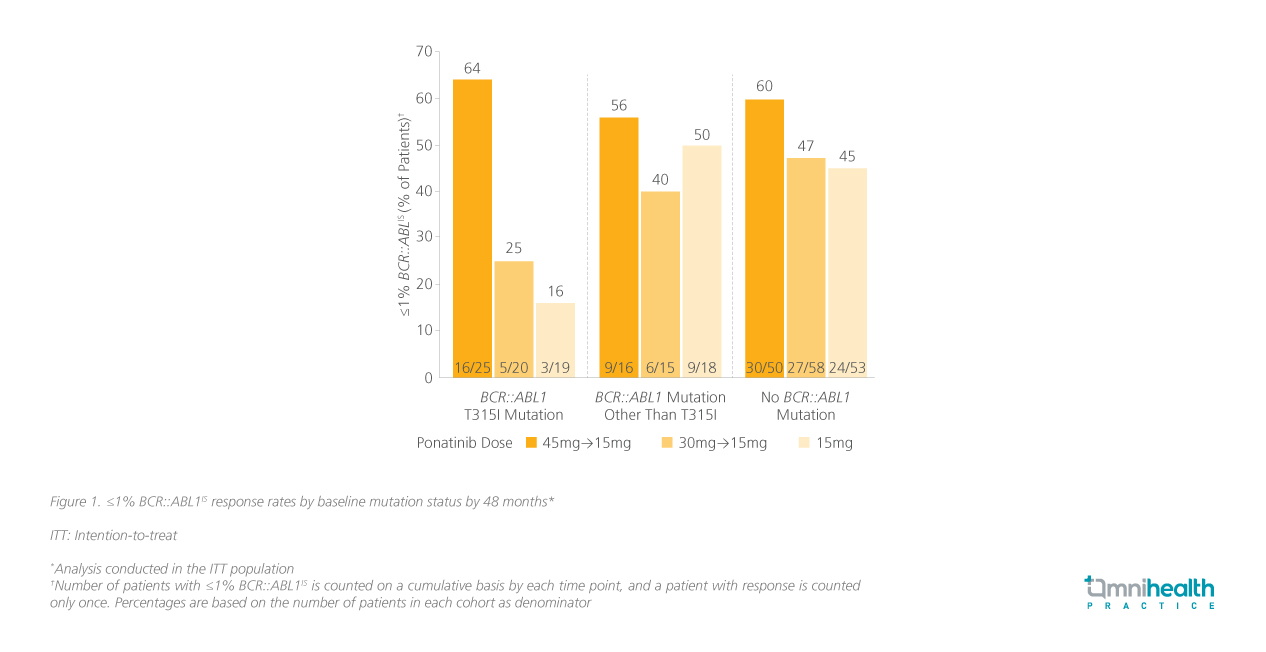 The 4-year efficacy outcomes of the OPTIC trial exhibited ponatinib’s durable efficacy, particularly in patients with the T315I mutation.5 At 48 months, those who received the 45mg starting dose showed greater response rates compared to patients who started on lower doses, particularly in achieving ≤1% BCR::ABL1IS (figure 1).5