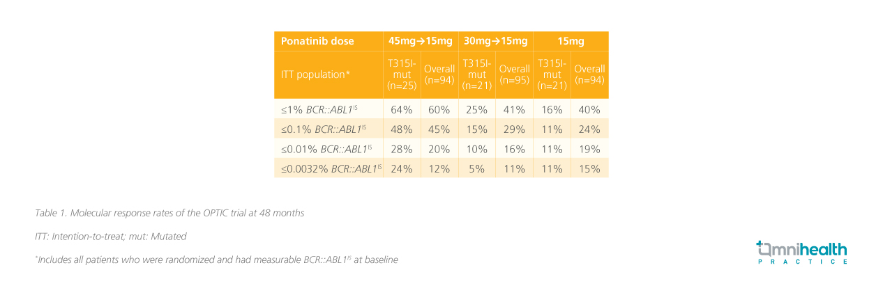 To assess and optimize the efficacy of ponatinib, the phase 2 OPTIC trial recruited patients with CP-CML who were resistant to ≥2 prior TKIs or harboring the T315I mutation and employed a response-based dosing strategy, where patients were randomized into 3 cohorts with starting daily doses of 45mg (n=94), 30mg (n=95), and 15mg (n=94) of ponatinib respectively.2 The primary endpoint was achieving complete cytogenetic response (CCyR), defined as a BCR::ABL1 transcript level ≤1% (BCR::ABL1IS) at 12 months.2 Upon achievement of the primary endpoint, patients in the 45mg and 30mg cohorts were required to reduce their subsequent dose to 15mg.2 Dose reduction to a minimum of 10mg was allowed for patients who experienced adverse events (AEs).2