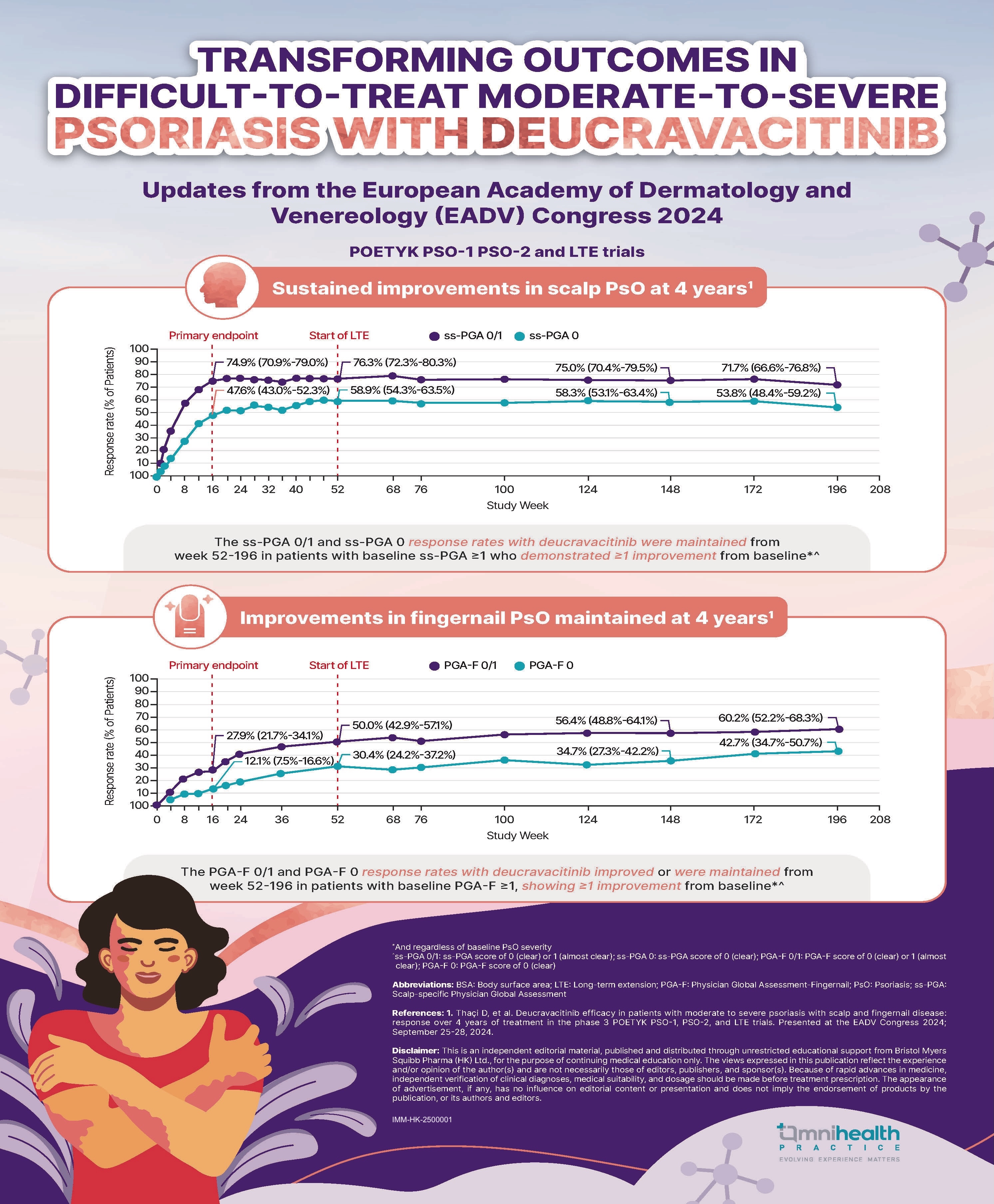 - Thaçi D, et al. Deucravacitinib efficacy in patients with moderate to severe psoriasis with scalp and fingernail disease: response over 4 years of treatment in the phase 3 POETYK PSO-1, PSO-2, and LTE trials. Presented at the EADV Congress 2024; September 25-28, 2024.