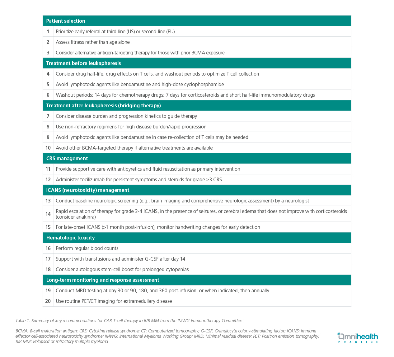 As CAR T-cell therapies continue to show promise, a panel of experts in the field of hematopoietic cell transplantation, cell therapy, and multiple myeloma therapeutics from the International Myeloma Working Group (IMWG) gathered to provide consensus guidelines to optimize the use of CAR T-cell therapy and ensure its safe and effective implementation in clinical practice.1 The consensus seeks to standardize management by offering comprehensive recommendations on patient selection, bridging therapy, lymphodepletion, response evaluations, and overall toxicity management.1 The key clinical considerations described are highlighted in table 1.1