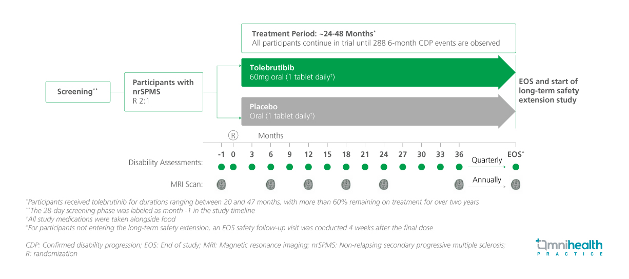 In the HERCULES trial, a total of 1,131 patients were randomized 2:1 to receive tolebrutinib 60mg orally once daily (n=754) or placebo (n=377).1 Eligible participants were aged 18-60 years, had an expanded disability status scale (EDSS) score of 3.0-6.5, had no clinical relapses within the prior 24 months, and demonstrated confirmed disability progression within the previous year.1 Baseline demographic and clinical baseline characteristics were similar and well-balanced between the two treatment arms.1