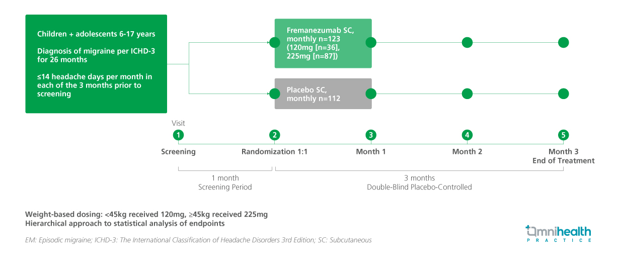 This multicenter, randomized, double-blind, placebo-controlled, parallel-group study enrolled 237 participants, who were randomized 1:1 to receive weight-based monthly subcutaneous injections of fremanezumab (120mg for participants <45kg; 225mg for ≥45kg) or matching placebo over a 12-week double-blind treatment period.1 Eligible participants had a documented diagnosis of migraine for at least six months and reported no more than 14 headache days per month at baseline.1 A total of 234 participants were included in the efficacy analysis (fremanezumab, n=123; placebo, n=111).1 Baseline characteristics were well balanced across both groups, with a mean age of 13.3 years in the fremanezumab group.1