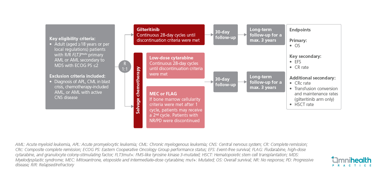 The primary endpoint was OS.1 Secondary endpoints included event-free survival (EFS), complete remission (CR) rate, composite complete remission (CRc) rate, overall response rate (ORR), hematopoietic stem cell transplantation (HSCT) rate, transfusion conversion rate, and maintenance rate (for the gilteritinib arm only).1