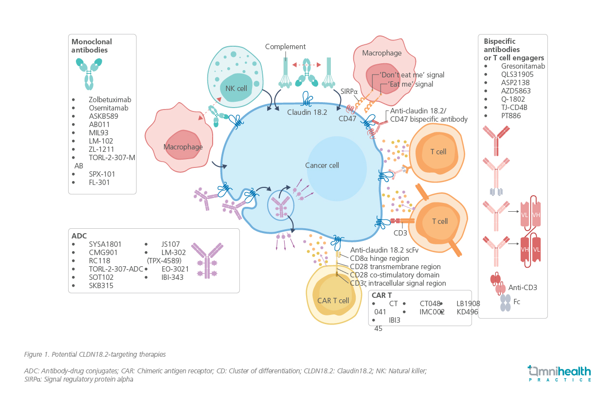 The prevalence of CLDN18.2 expression in GC/GEJC is well documented.6 In a study involving 65 patients with advanced disease, 73.8% (n=48) tested positive for CLDN18.2.6 Moreover, a pooled analysis of two phase 3 trials involving 4,507 patients found that 38.4% had CLDN18.2-positive tumors further supporting its relevance as a treatment target.7 This growing evidence has spurred the development of multiple CLDN18.2-targeted agents (figure 1).5