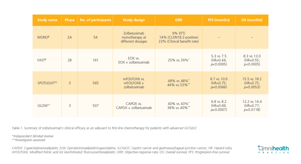 Although zolbetuximab monotherapy showed limited efficacy in the MONO study, combining it with chemotherapy has demonstrated clear advantages.8-11 This approach enhances T-cell infiltration and stimulates the release of pro-inflammatory cytokines, leading to improved clinical outcomes and better survival benefits for patients with advanced GC/GEJC (table 1).4,9